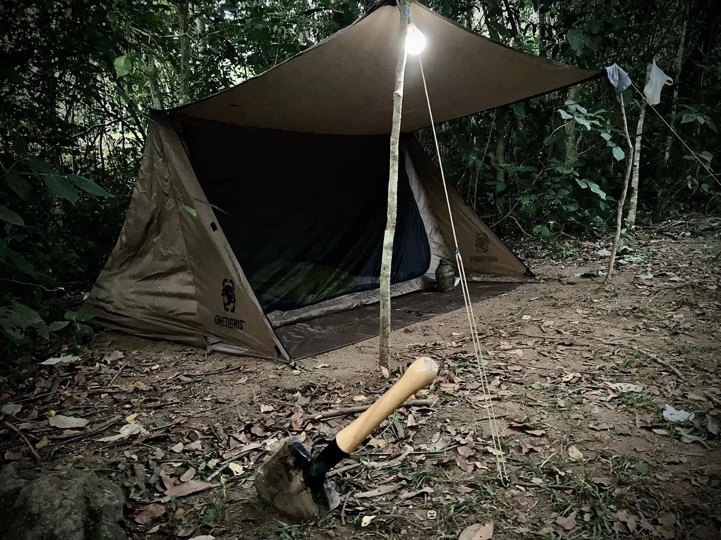 Встречал новый год в лесу с этой палаткой. В целом понравилась. С установкой нужно немного напрячься, т.к. дуг нет и палатку нужно ставить либо на трекинговые палки, либо вырезать подходящие палки из дерева, либо растягивать между деревьями. Я ставил саму палатку на трекинговые палки, а крышу растягивал на вырезанных из дерева. Справился примерно за 40 минут, т.к. нужно привязывать много растяжек. В следующий раз думаю, что уйдет минут 10-15. День был снежный. Первые 12 часов все было хорошо. Получил огромное удовольствие, пока сидел под крышей у костра. Но ночью палатка протекла. Я оставил крышу на ночь, но, видимо, это была ошибка. В районе верхнего шва скапливалась влага, в итоге внутри палатки образовалось две лужи пришлось уезжать домой. Если делать скидку на то, что палатка для бушкрафта и складывать её при дожде, то думаю, что всё будет ок. Попробую её еще пару раз, если будет чем дополнить отзыв, то дополню.