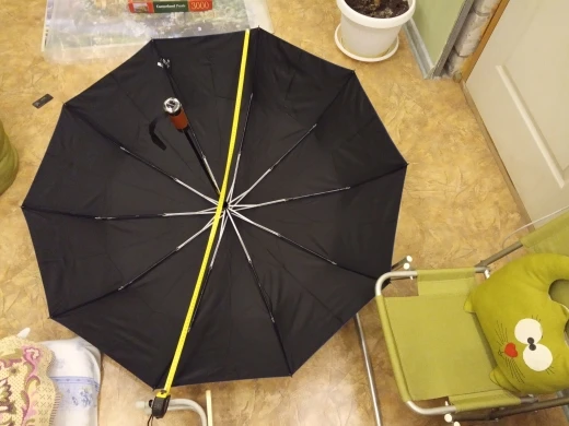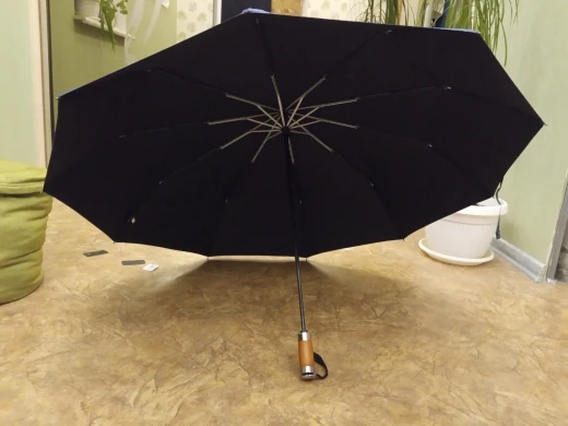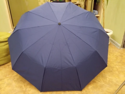Зонт в раскрытом виде имеет большой купол из двух слоев ткани, от этого он в закрытом виде толстый и тяжёлый! Ручка удобная, автомат работает хорошо, нитки не торчат. До Подмосковья дошёл за неделю, получал на кассе магазина Пятёрочка по коду из СМС.