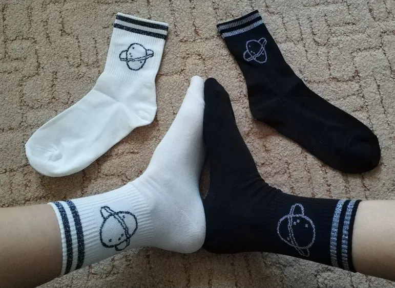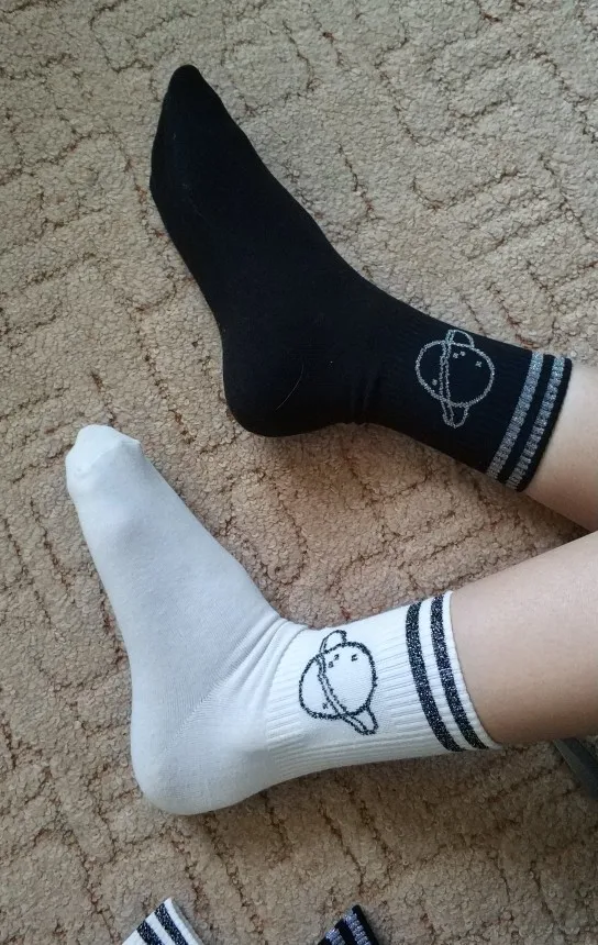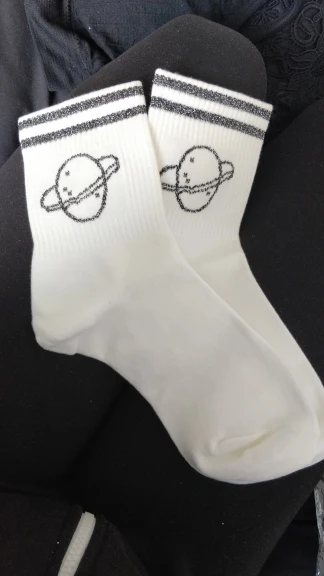 заказала сразу 2 пары: белые и черные. Качество носков хорошее, не сильно тонкие, но и не толстые. На размер 37,5 подошли в самый раз. Сняла 1 звезду, за то что верхние полоски и рисунок сатурна сделан серебряными нитками, а не черными, как на фото продавца, на мой взгляд с серебряными нитками они выглядят хуже.