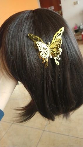 Сам парик хороший. Волосы приятные, не стальные (как это бывает). Правда чёлка немного редкая, не такая, как на фотографии. Заколка-бабочка красивая, качественная, притензий нет. В целом все устроило.
