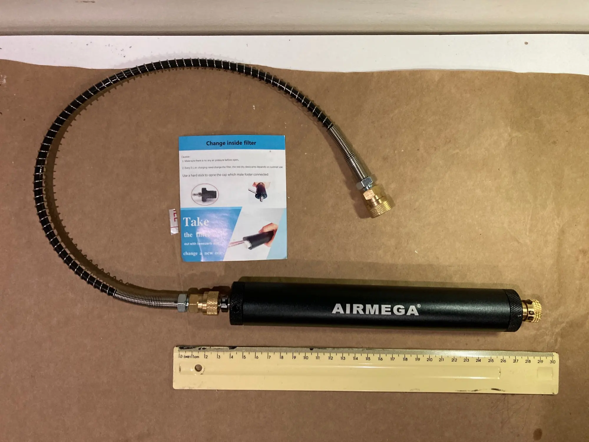 Пришло в течение месяца. В комплекте осушитель, шланг ВД, 20 патчей. В осушители уголь, силикатный порошок. Резиновые колечки. На осушителе следы затяжки в пазиках. На вид конструкция прочная. Буду пробовать, дополню.
