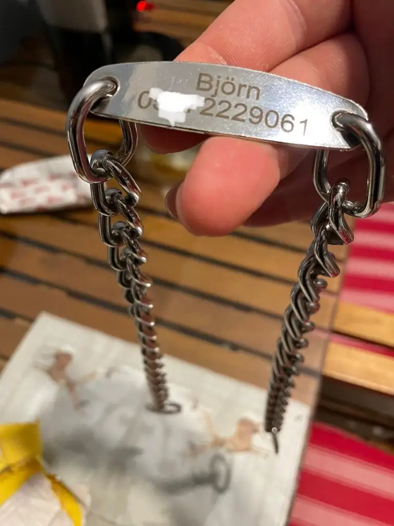 Товар пришёл как и заказывал. Я отправил ему свою информацию и он быстро отправил цепь-ошейник. Надпись на жетоне выполнена в виде "нанесения" текста на жетон, а не гравировки. Текст вроде не стирается трением ногтем. Цена низкая. Хотел малость укоротить и... Друзья, каждое звено и кольца пропаяны!!!