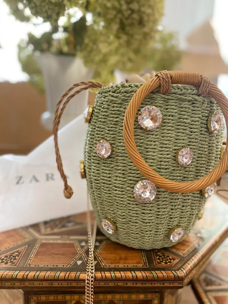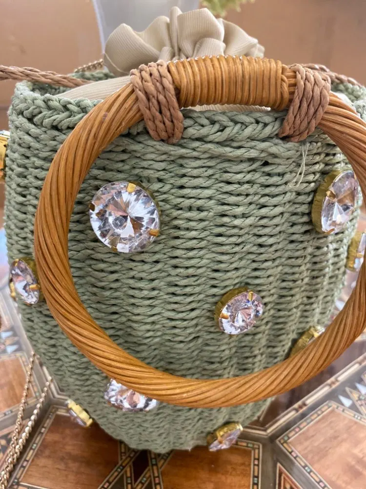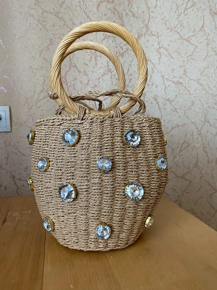 Плетеная женская сумка с ручками из ротанга, новинка 2022, маленькая сумочка из ротанга с алмазным жемчугом, женская сумка в натуральном стиле, пляжная сумка через плечо из ротанга