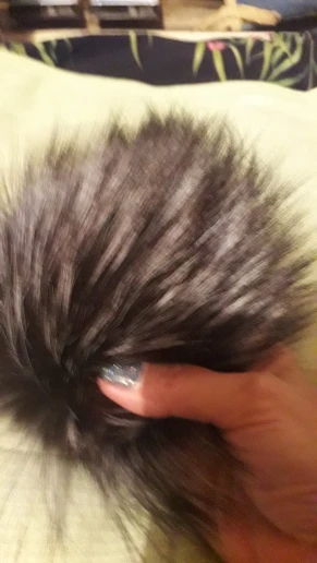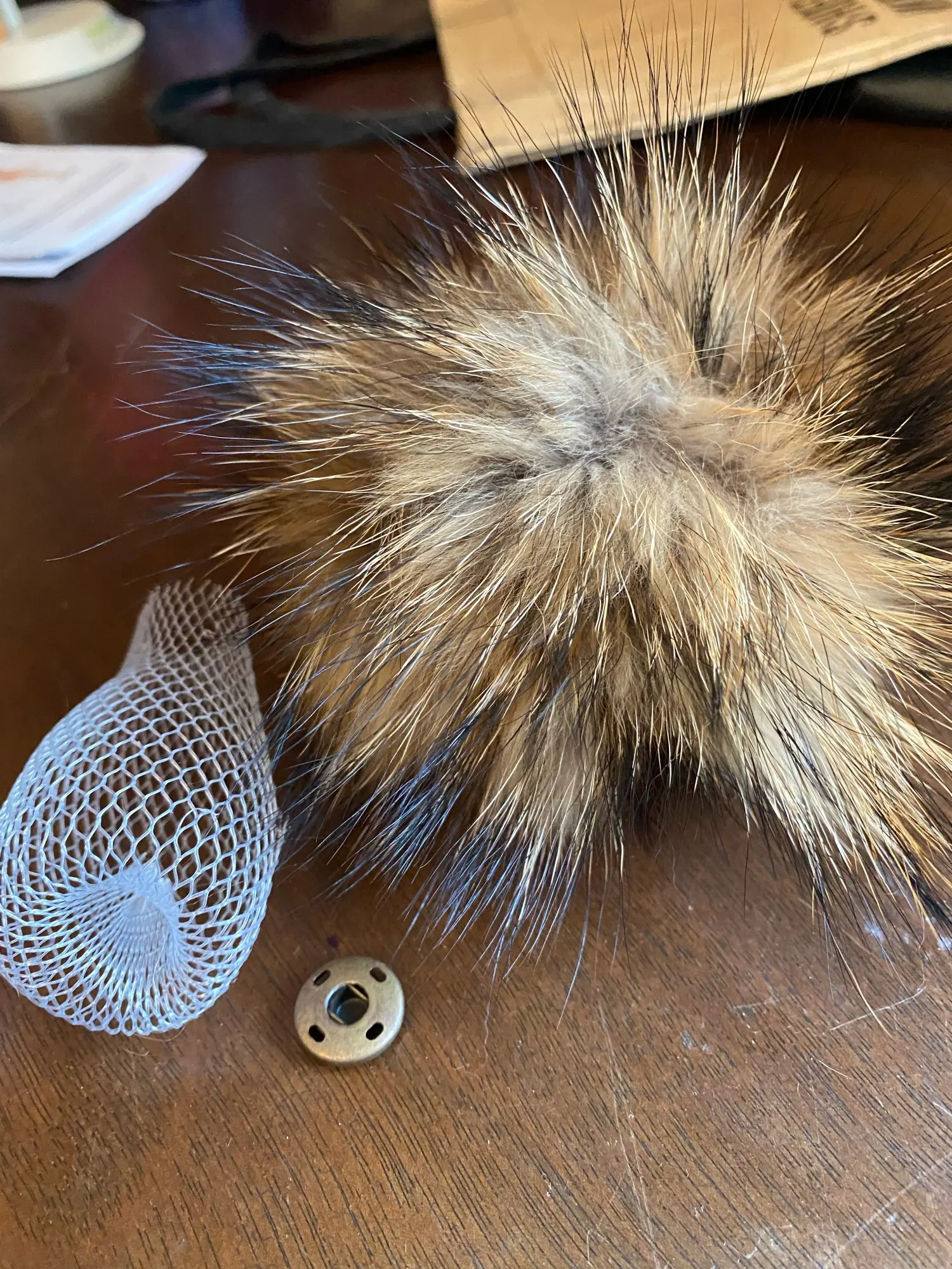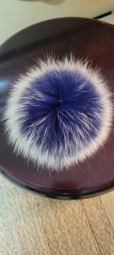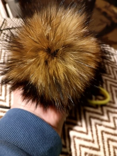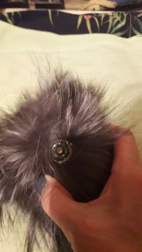 Приходит в сеточке, так что при транспортировке не помялся. На помпоне кнопка, можно прикрепить к любой шапке.