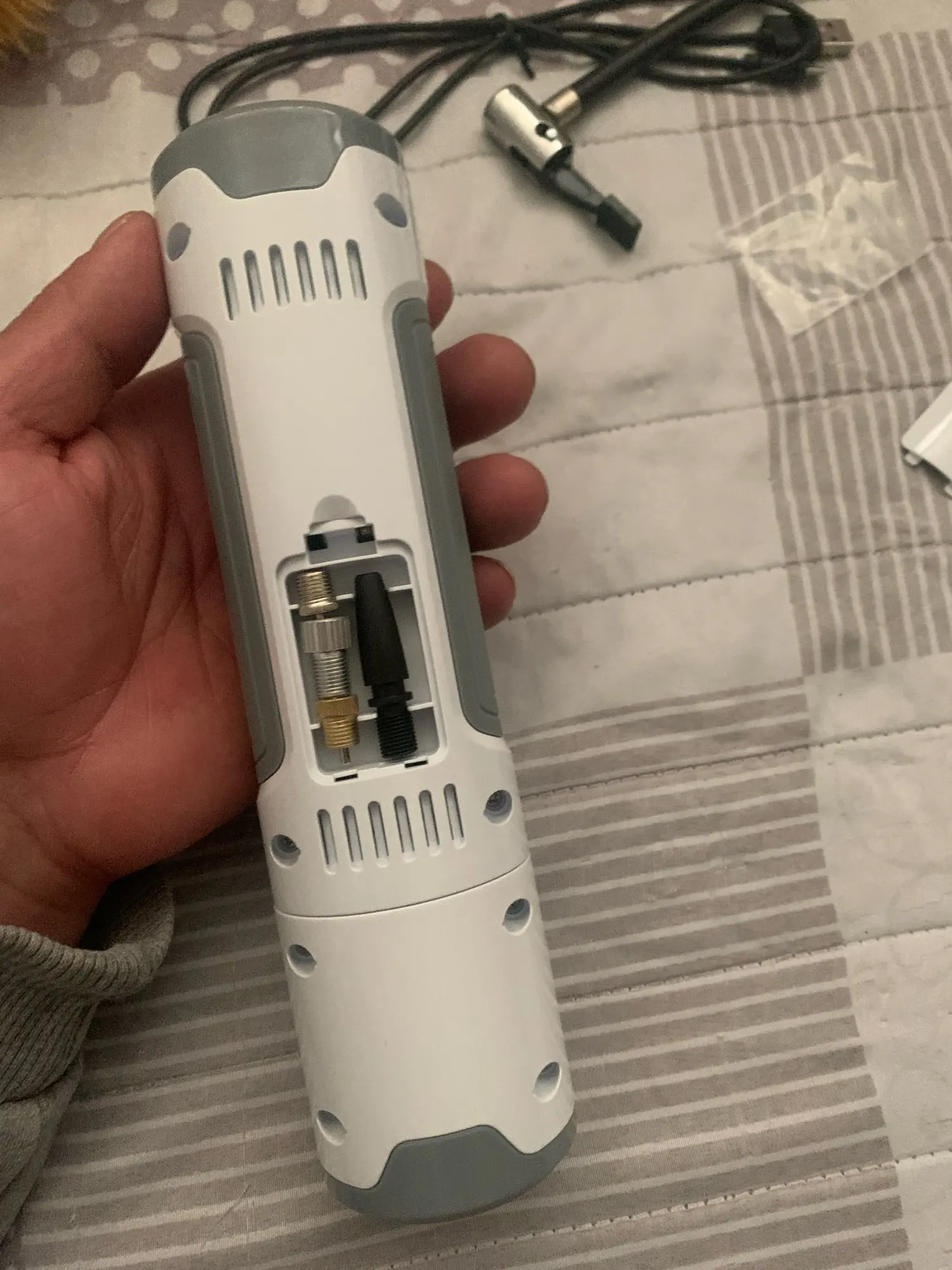 насос рабочий, все в целости и сохранности, удобный отсек для насадок. единствннная неприятность - насос начинает качать с 0.35 bar.