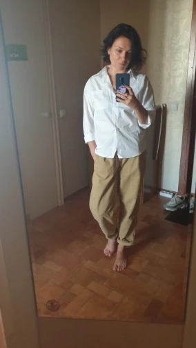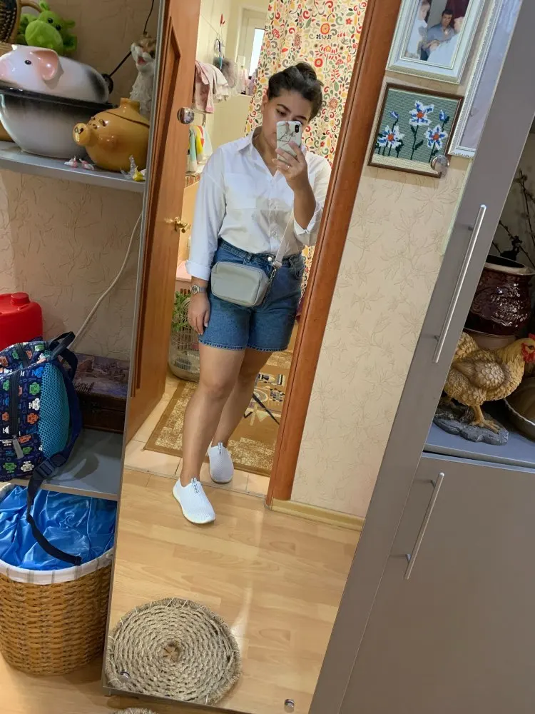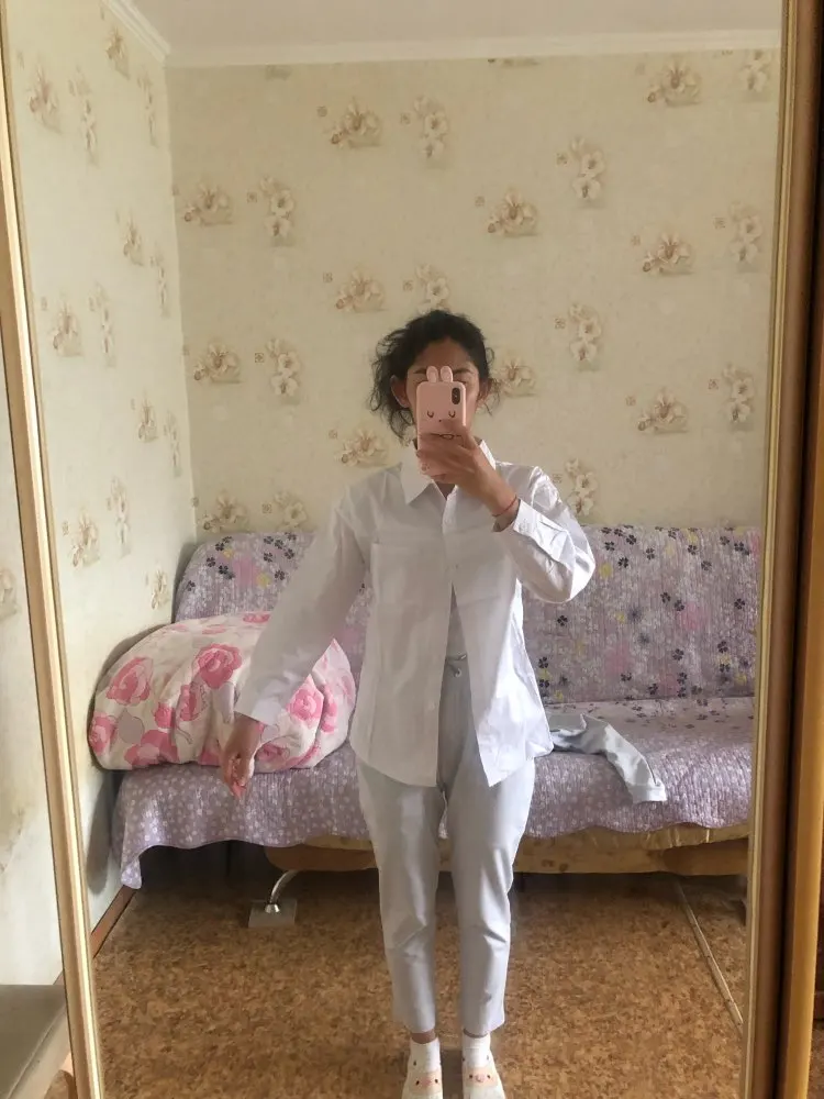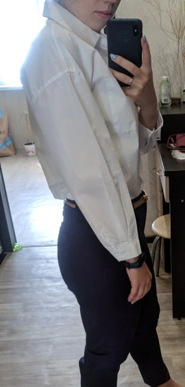 Плотная ткань, но при этом не толстая, немного трудно гладить, рукав не длинный, 3/4, если вы высокая, модель заправляется в брюки, но не удлинённая, оценка 4,5 из 5
