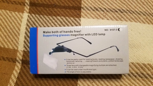 Товар дошел быстро Посылка шла меньше месяц в Казахстан.Упакована на совесть,коробка внутри не помялась.сама коробка из плотного картона. Вещь фабричная. можно даже в подарок. Впечатляет . Внутри сами очки с диодом и три линзы разного увеличения и отвертка ювелирная, думаю для замены батарейки. Оправа металлическая. Держится отлично,но крепления пластик, менять линзы надо осторожно и не часто,у меня с первого раза прикрепить не получилось, боялась лишнего нажима, чтобы не сломать.Сами линзы короткие, ограничивают обзор,немного не удобно.Брала еще лупы которые крепятся прямо на очки,с ними работать удобней ,линза на величину линзы очков .Ну это наверное для каждого индивидуально. В целом товар достойный. Продавцу 15 звезд. Продавца рекомендую.Большое спасибо !