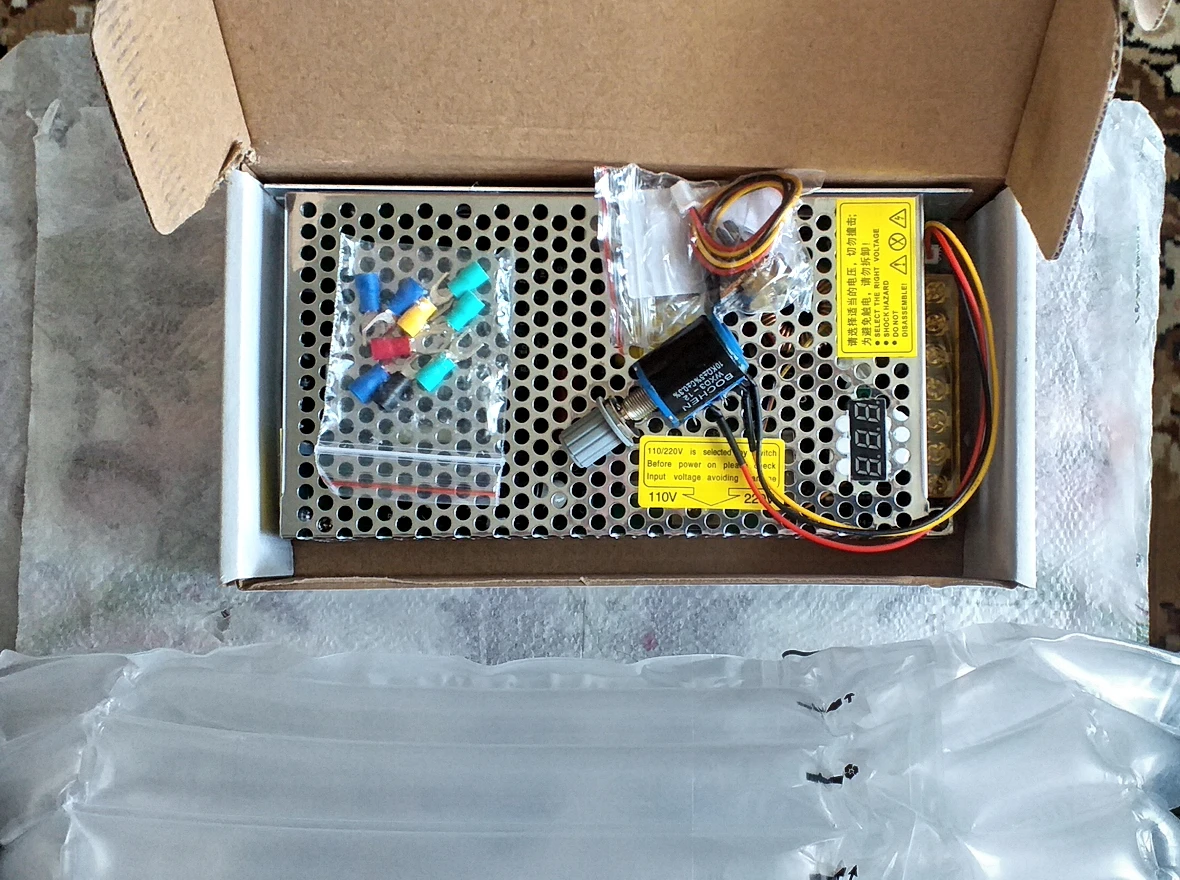 Заказ шел до Владивостока 27 дней. Упаковка хорошая - повреждений нет. Переключатель входного напряжения (110/220 В) находится внутри корпуса и без разборки к нему не подобраться. И кстати первоначально стоит на 220 В. Разобрал корпус - внутри пайка нормальная. Много свободного места и можно было сделать корпус физически поменьше. А с другой стороны в свободное место можно добавить (например дополнительные конденсаторы фильтра) элементы.Все элементы по виду новые. Проверил показания вольтметра - все точно. В комплекте идут 9 разьемов разного цвета и запасной переменный резистор который по размеру раза в 2 меньше переменника который уже стоит сразу с завода. Полагаю стоит (с завода) многооборотный переменный резистор. Встроенный вольтметр заклеен с завода (еле отодрал) прозрачной пленкой. . Продавцу за хорошую упаковку и годный товар ставлю 5 звезд. И естественно рекомендую продавца.
