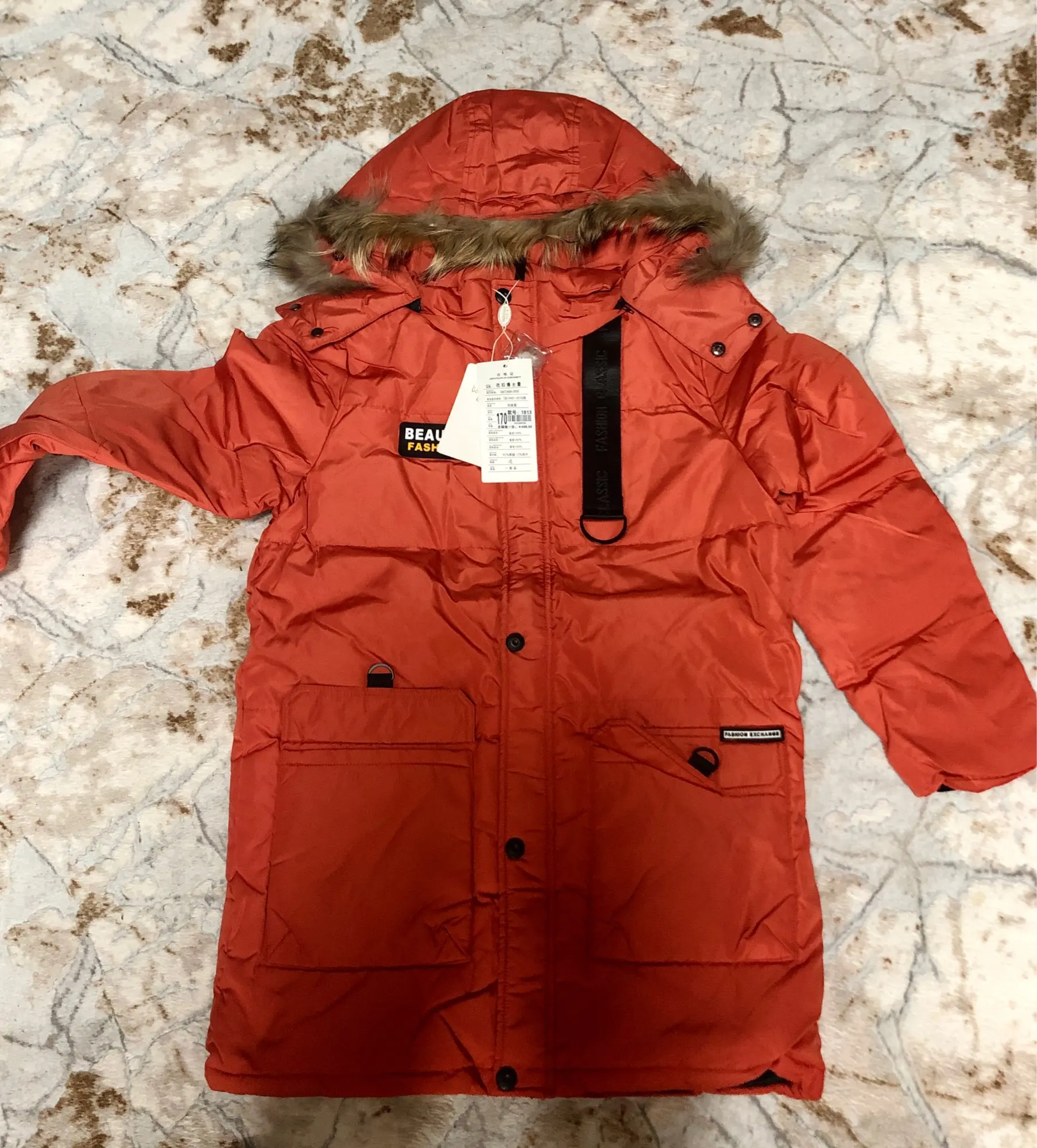 Заказ пришёл вовремя в Ташкент . Качество хорошее, запаха нет. Куртка - идеальная. Посмотрим как в мороз будет. Внешне никаких дефектов. Продавца рекомендую и благодарю!
