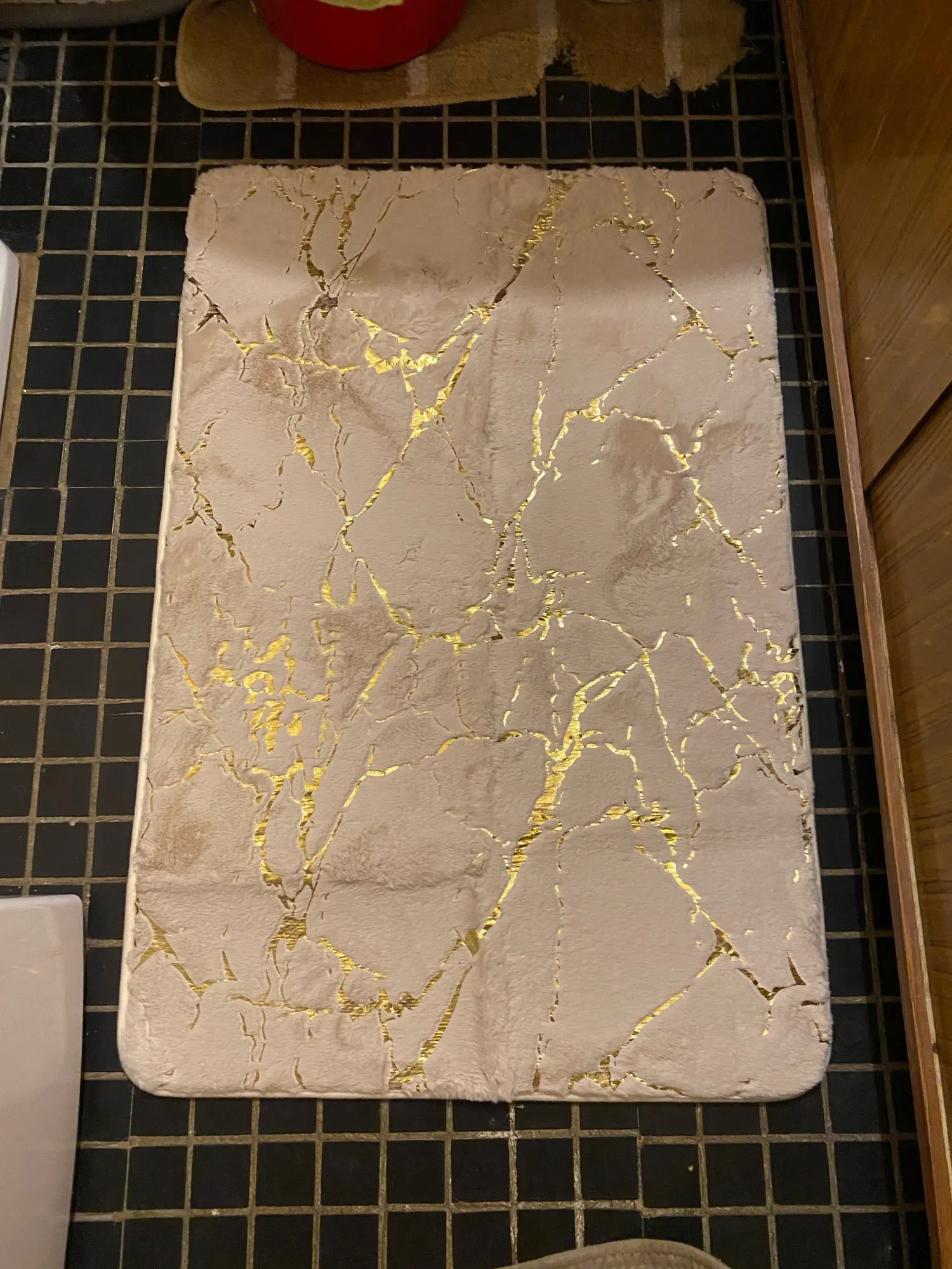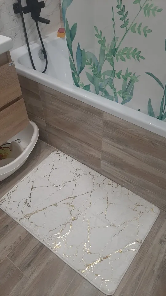 На первый взгляд ковер замечательный! Текстура похожа на мех искусственный. Золото немного ярковато для меня, но думаю со временем не будет так сиять. Ковер достаточно толстый.