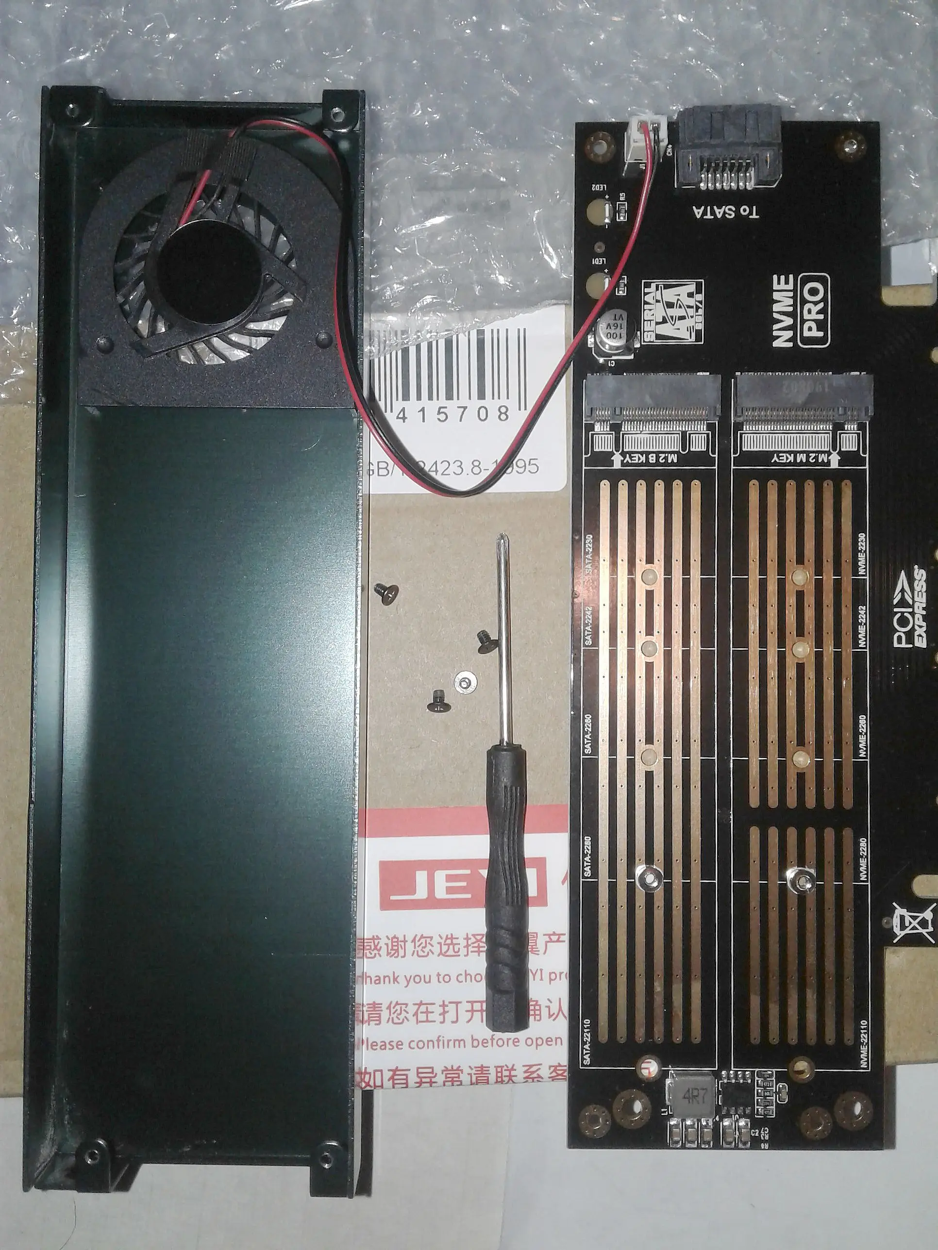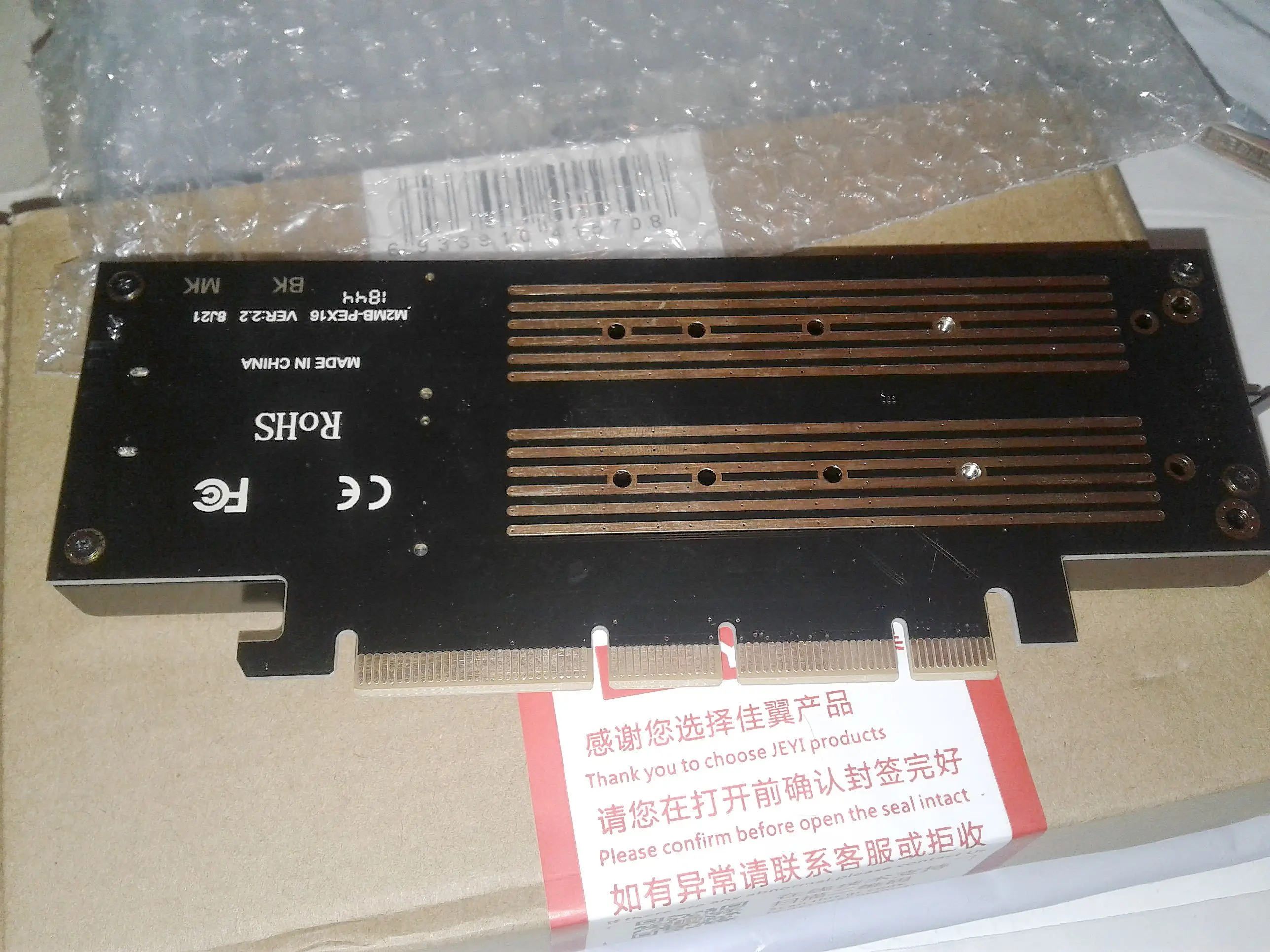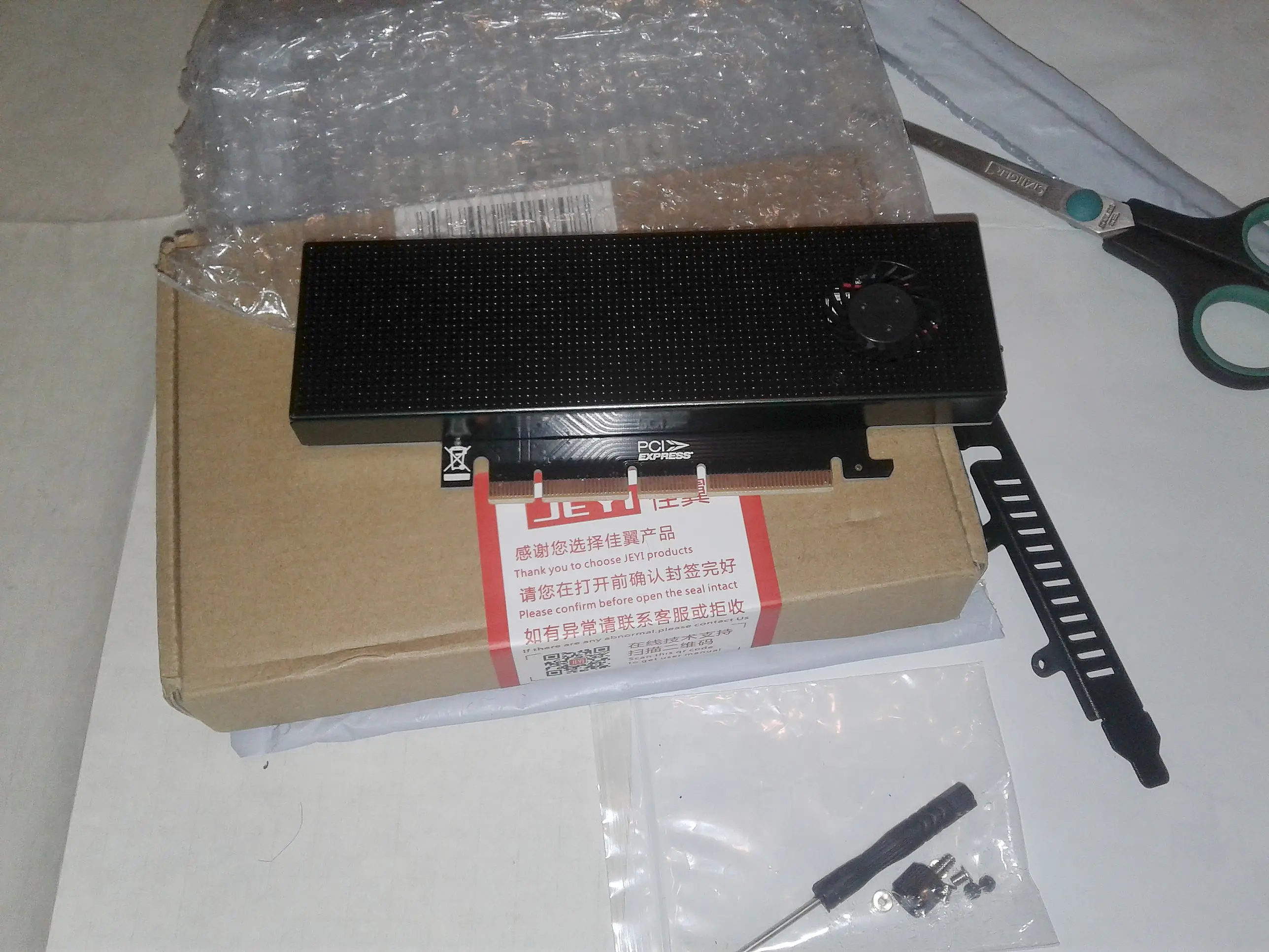 Товар шел довольно медленно, долго гулял по стране, и я уже даже начал сомневаться... Но, все же прибыл. И причем без видимых дефектов. Скорее всего за весь период путешествия его спасла хорошая упаковка, его положили в прочную картонную коробку, и еще был завернут в пупырчатый пакет. В комплекте так же имеется скоба крепления, пакетик с метизами и миниатюрная отвертка. Использовал для проверки SAMSUNG 970 EVO - полет нормальный. Думал встроенный вентилятор будет шуметь, но его не слышно даже, я было испугался что не работает. Скоба крепления болтается на плате, но поверьте, для такой легкой платы она и не нужна вовсе, достаточно просто воткнуть ее в слот PCI-E. Самое главное то что товар наконец прибыл и он функционирует. Продавцу и магазину большой респект!