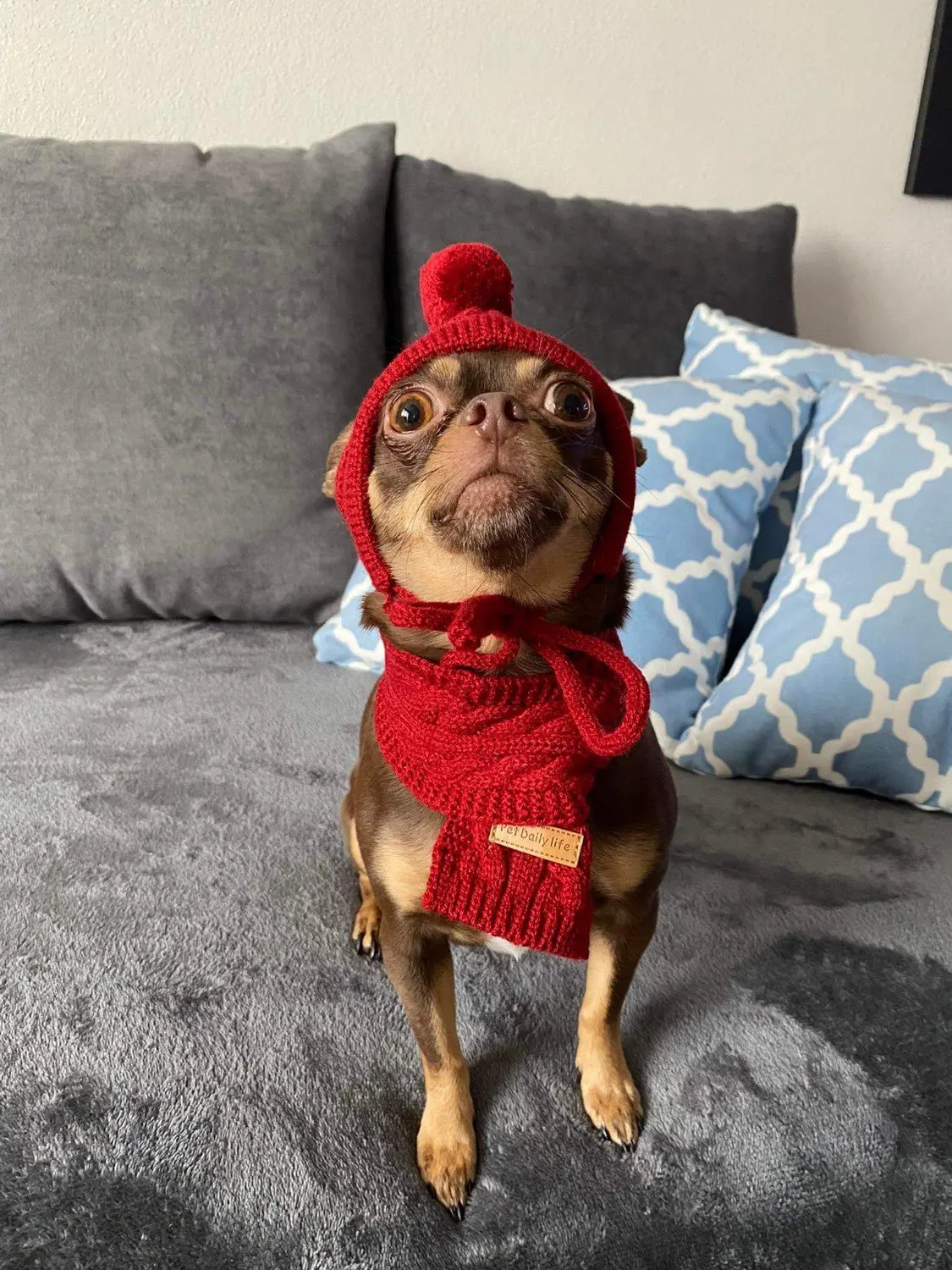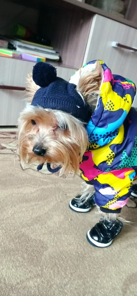 Шапочка пришла быстро, размер S великоват на нашего щенка чихуахуа, но на взрослого чиха в самый рас будет! Так что будет нам на вырост)