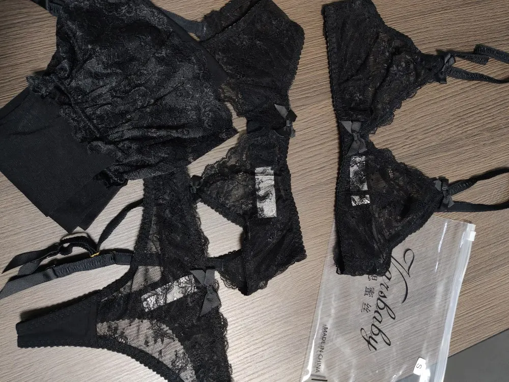 Сексуальный кружевной ультра-тонкий удобные без косточек комплект нижнего белья для женщин для девочек с бантами; Дышащие нижнее белье бюстгальтер + трусики + подвязки + чулки 4 предмета в комплекте