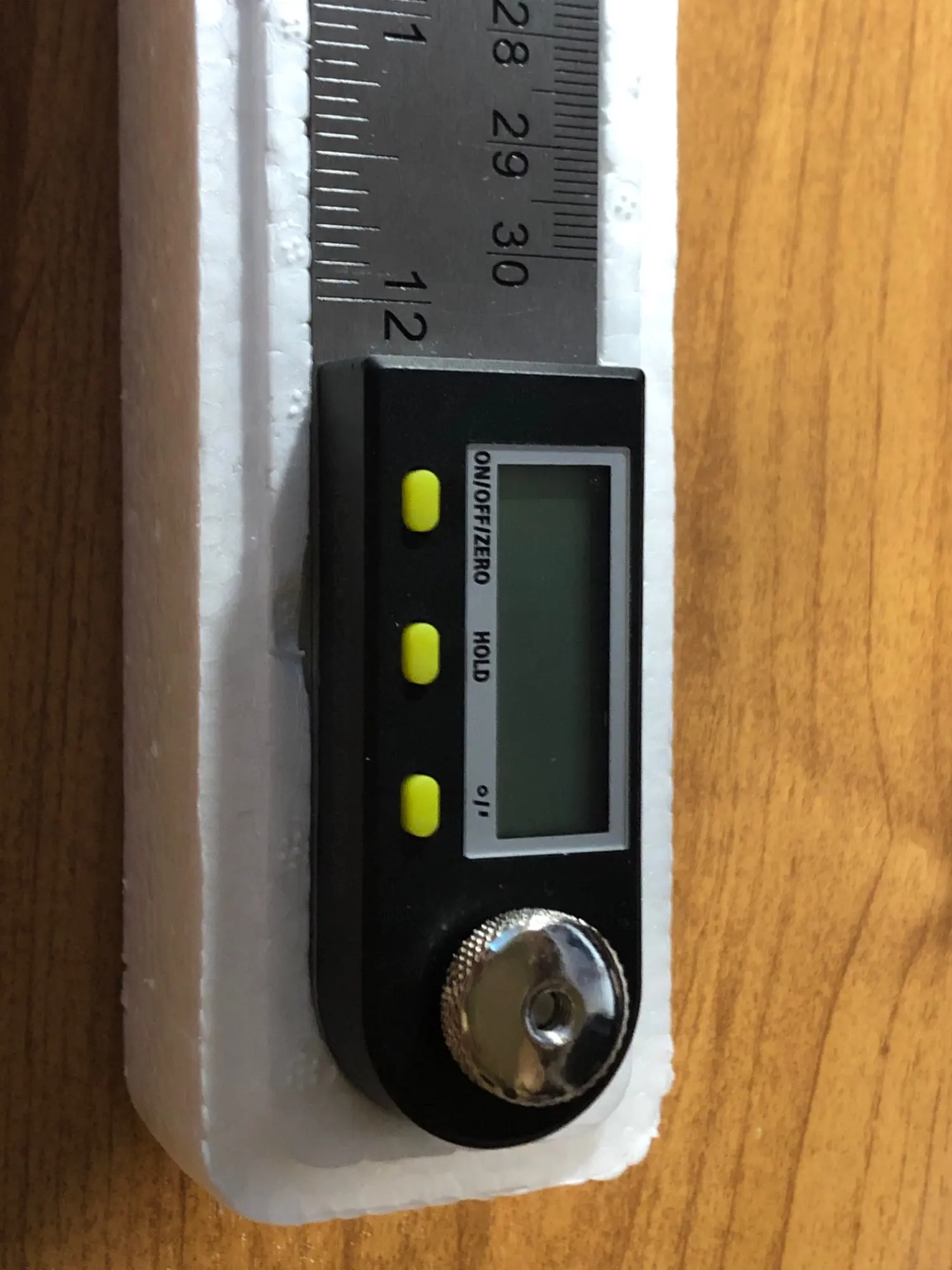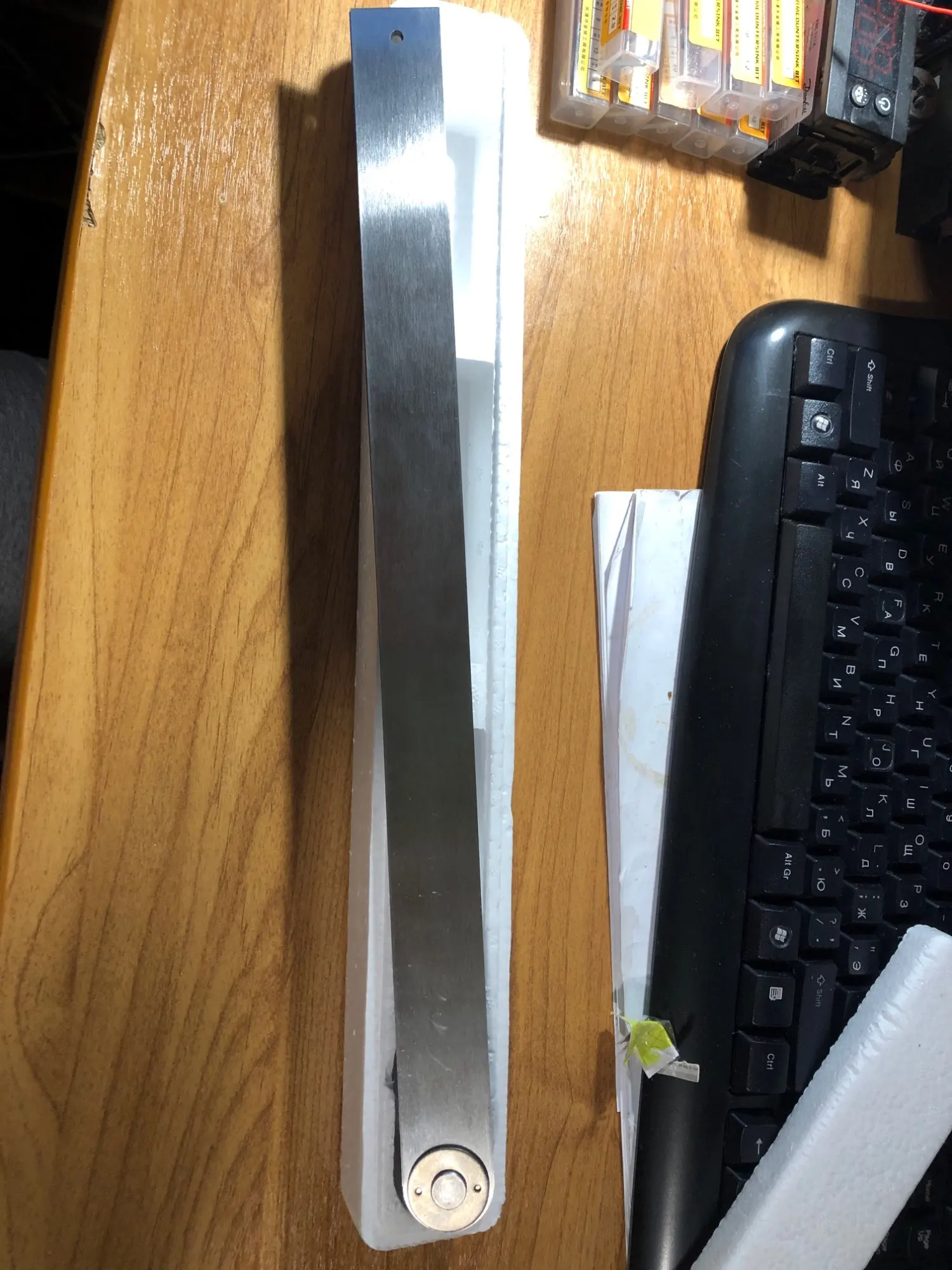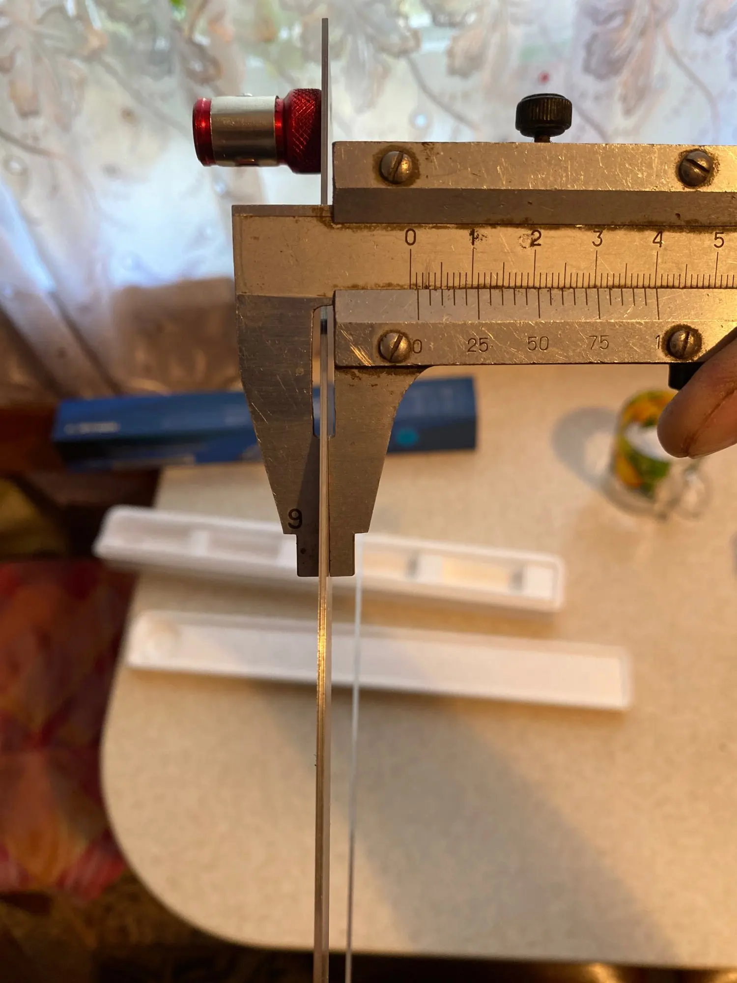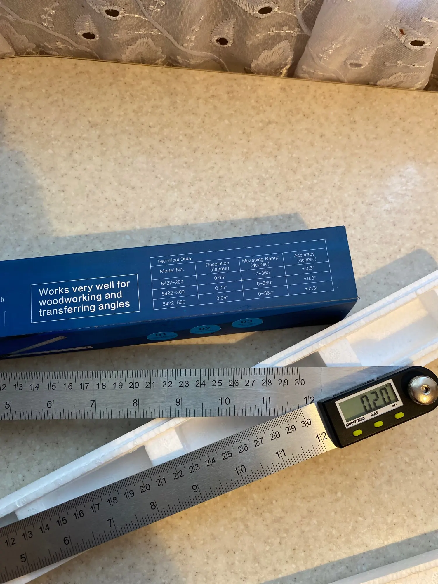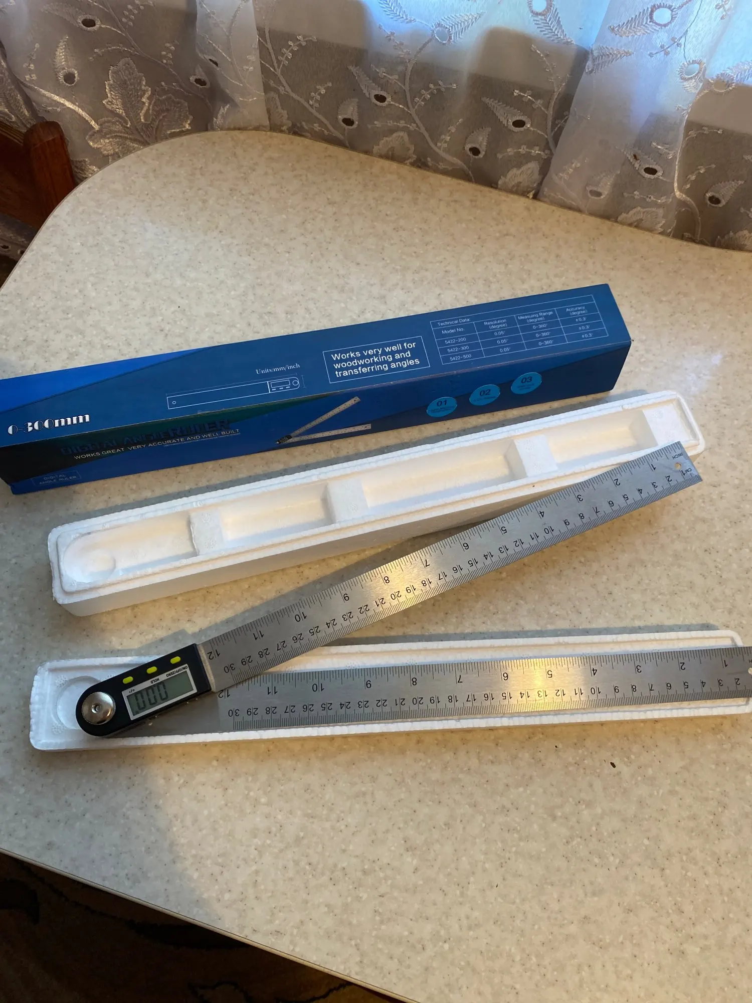 Доставка 12 дней. Линейки сделаны из высокопрочной стали толщиной 1.2мм (руками не согнуть). Синее - это защитная пленка. Довольно тяжелый (235г). Люфта нет. Точность проверить нечем, но при полном обороте возвращается в 0. Качество отличное, рекомендую к покупке.