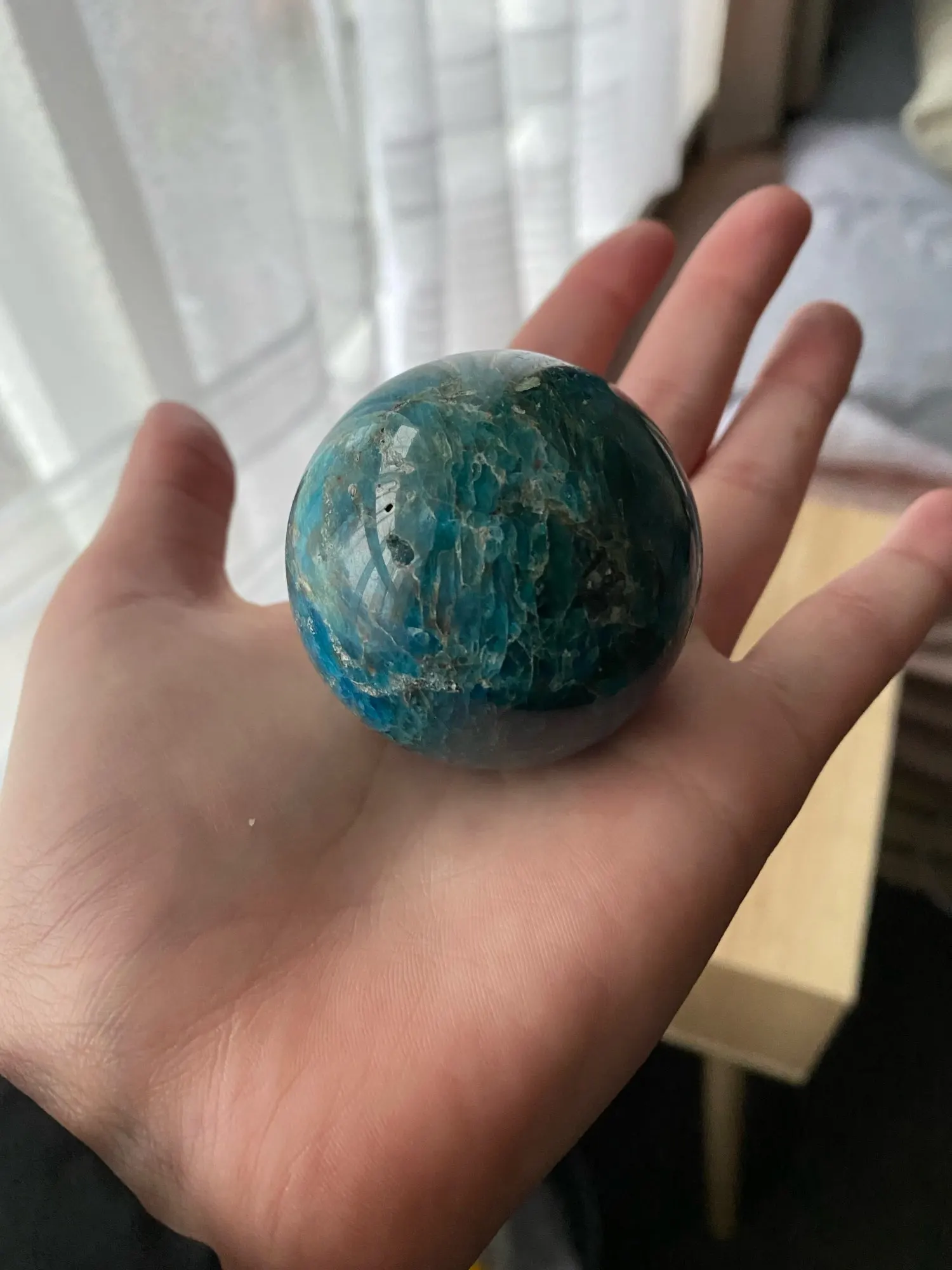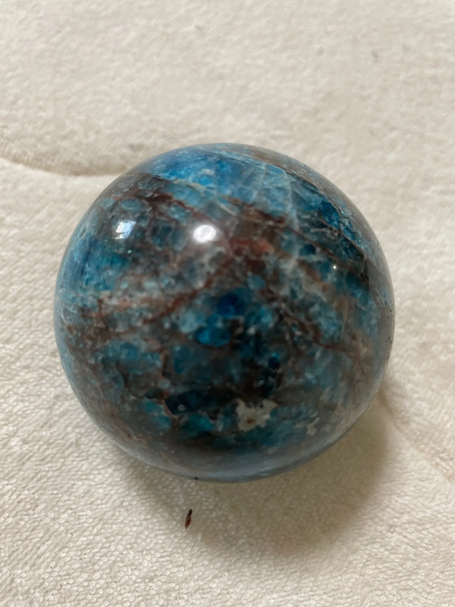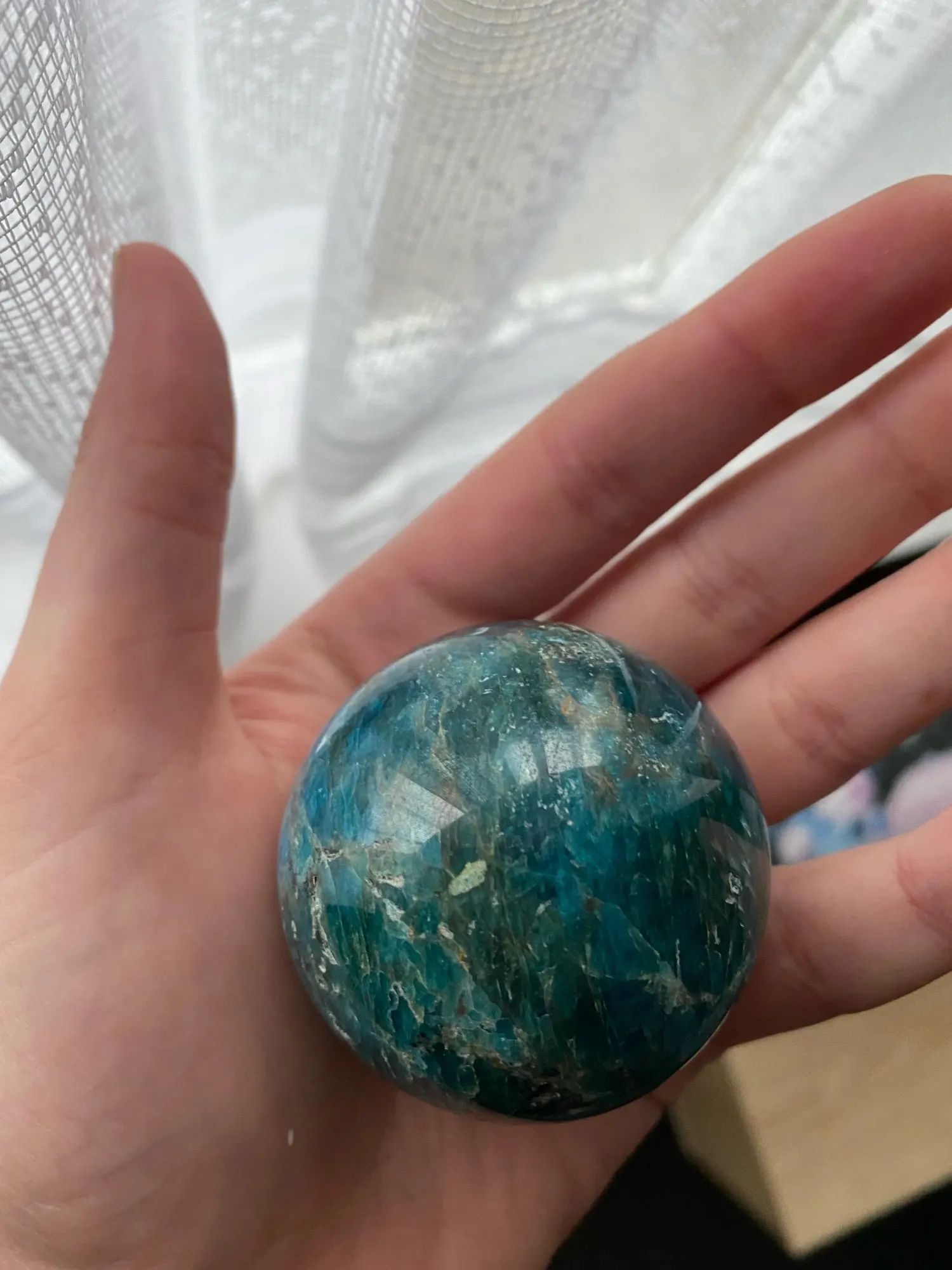 Сфера пришла с заделанными трещинами(на фото обвела, что бы было видно, заделаны крупные выбоины раствором каким то, и ещё куча мелкий есть сколов). Продавец по спору вернул половину сумму, но осадок остался, хотелось конечно получить качественный товар. Прикрепляю фото как камень выглядит при ярком солнечном свете и при обычном