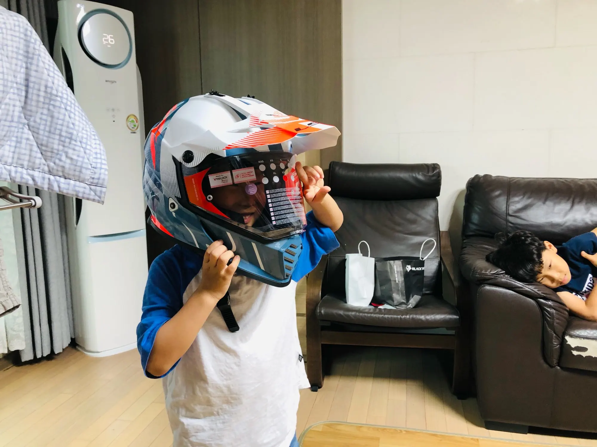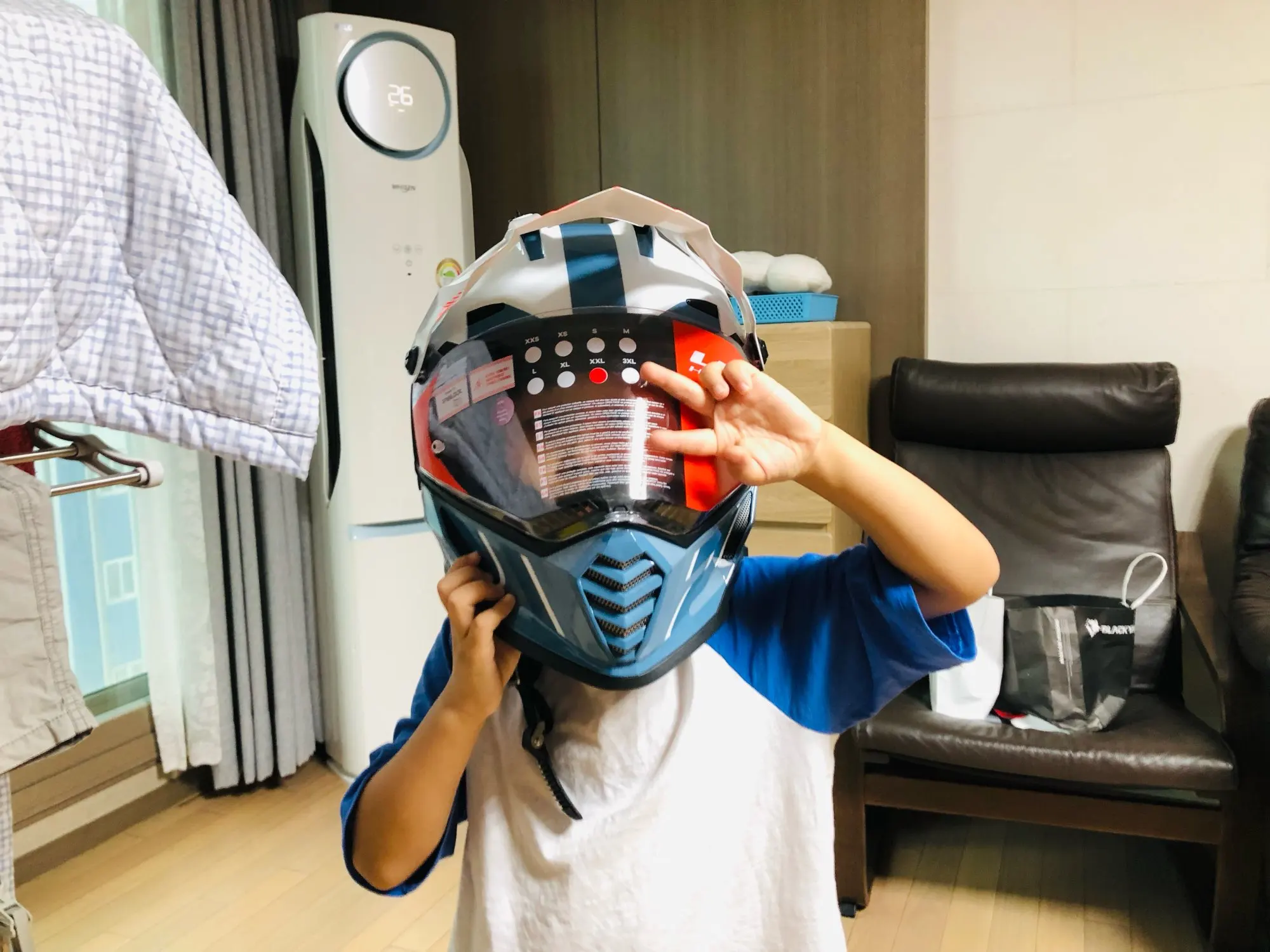 Шлем классный. Размер L на голову 56,5 вполне хорошо сидит. Был выдернут из механизма темный визор, а механизм заблокирован. С трудом смог повернуть рычаг и вставить очки. В остальном все хорошо.