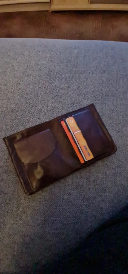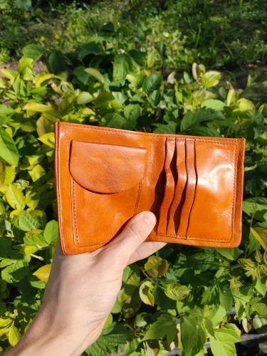 Кошель просто балдёж балдёж, сильно насыщенный рыжий. В тени если смотреть то как на фото у продавца но если на солнце но вообще отрыв полный, очень рад! Купюры кстати вмещаются без проблем.