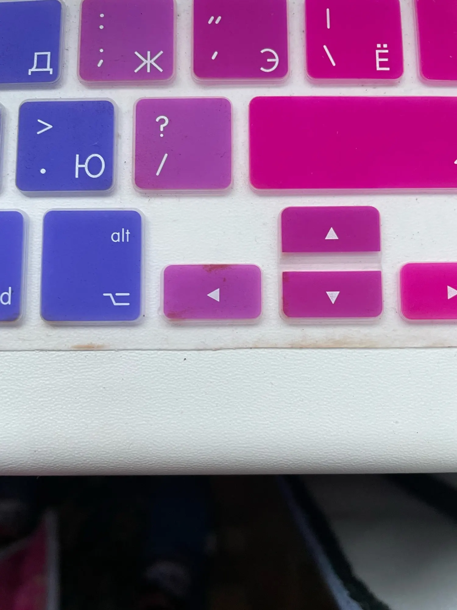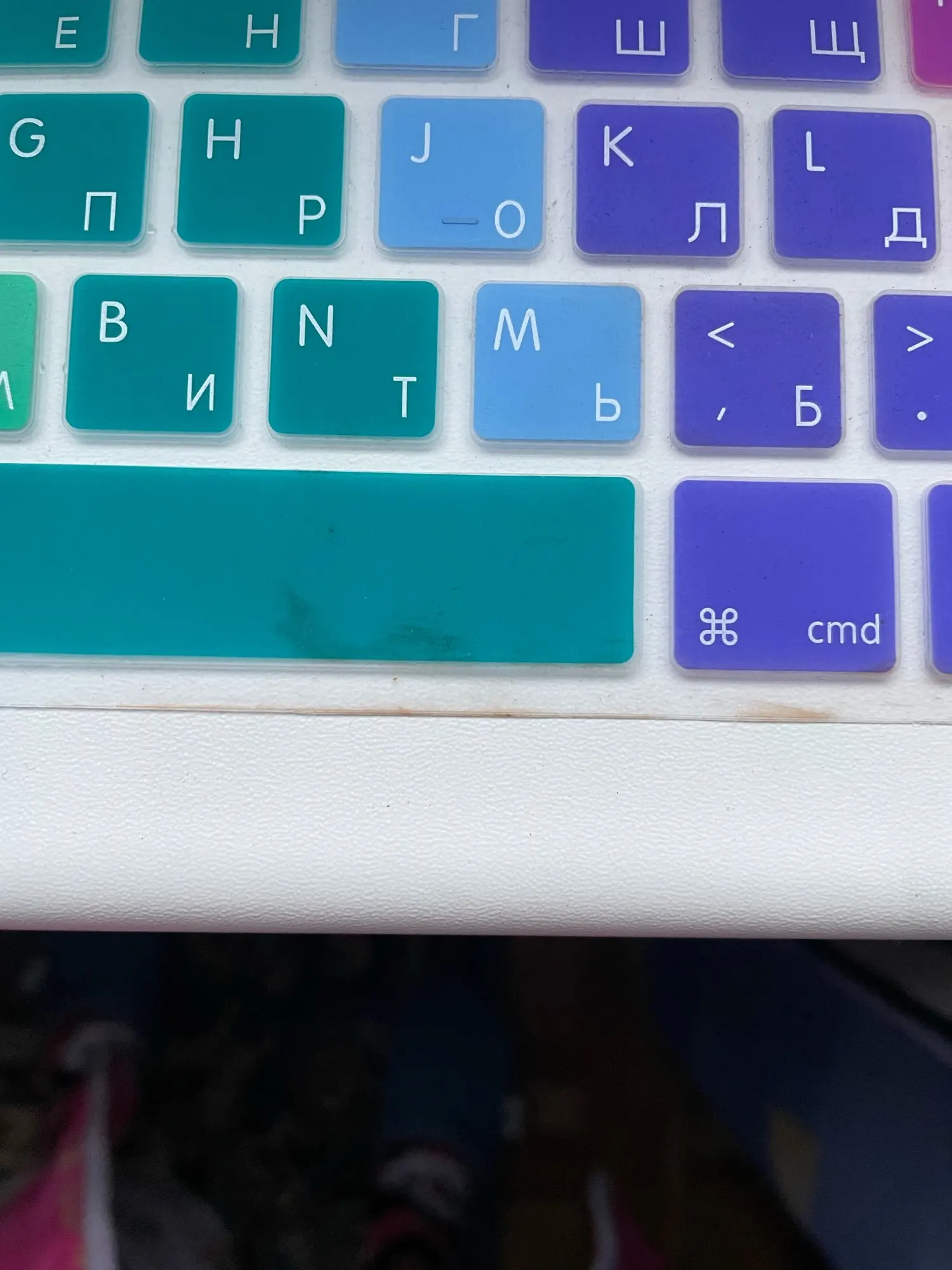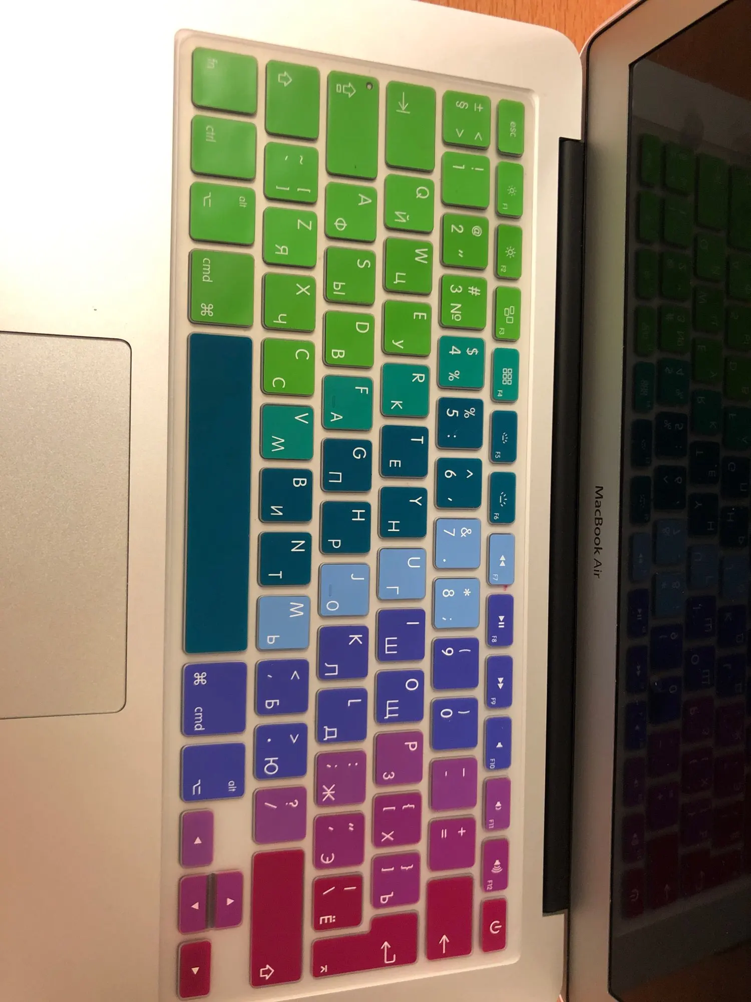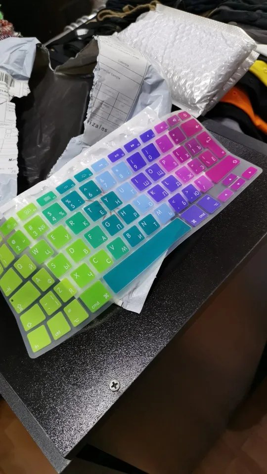 На фото первый цвет желтый. А в реале желтого цвета на клавиатуре нет. В общем, не понравилось, что цвета немного отличаются. А вообще, накладка прекрасная. Советую.