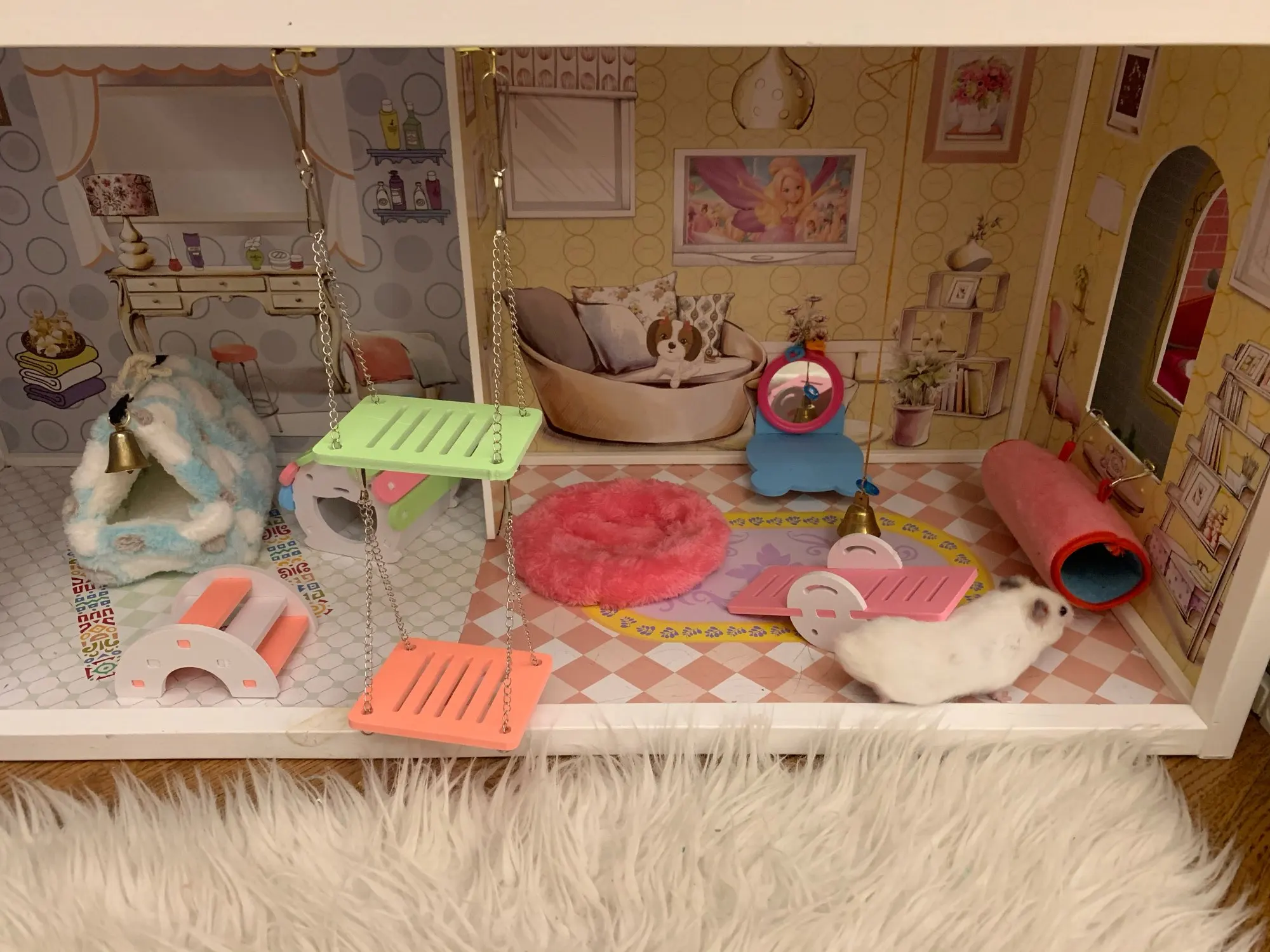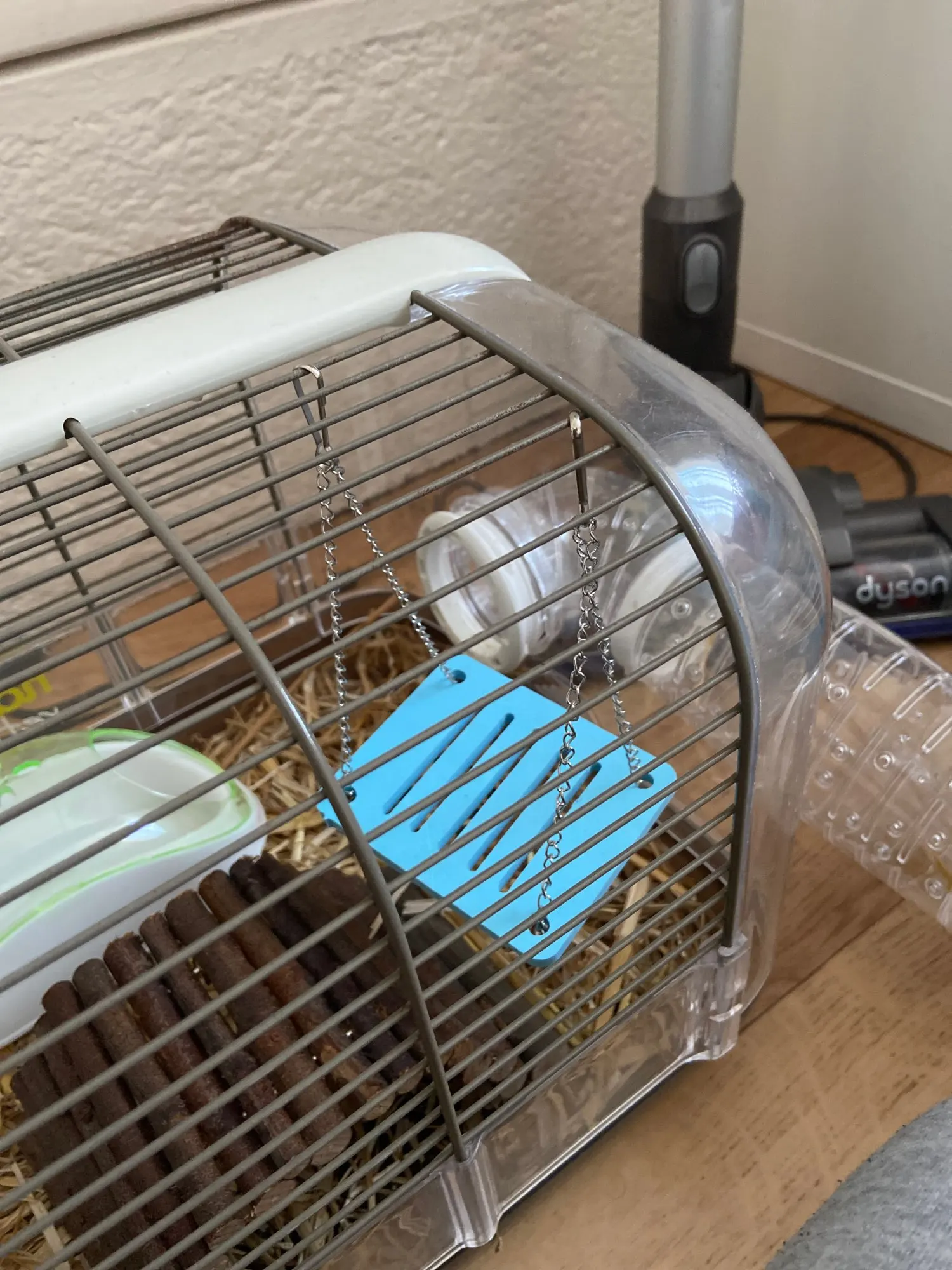 Качель даже не из пластмассы,а из какого то твердого пенопласта,сгрызут быстро,сверху бы надо какие то стопорки...Для крыс очень маленькая.