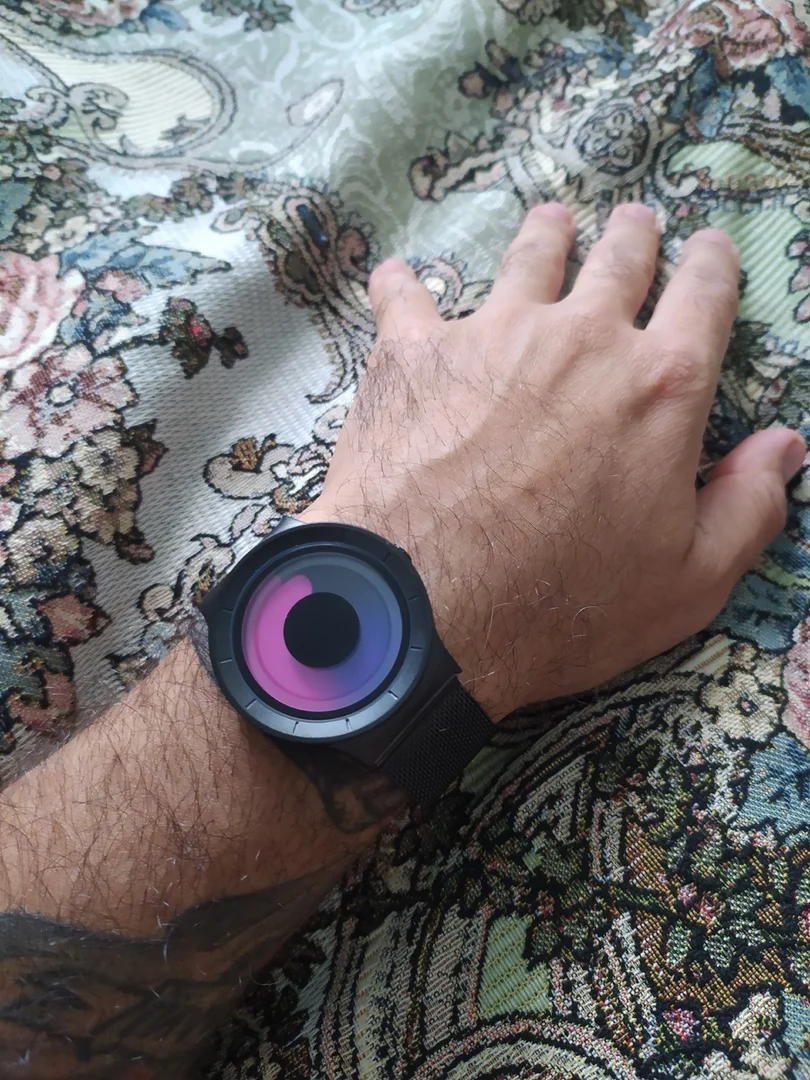 Очень качественные и стильные часики. Описанию соответствуют полностью за одним исключением: внешний контур показывает часы, а внутренний - минуты, хотя в описании наоборот. Сидят удобно, ремешок достаточно приятный. Поначалу может показаться, что они не работают, но если приложить часы к уху со стороны батарейки, то вполне себе исправно тикают. В общем, к покупке рекомендую!