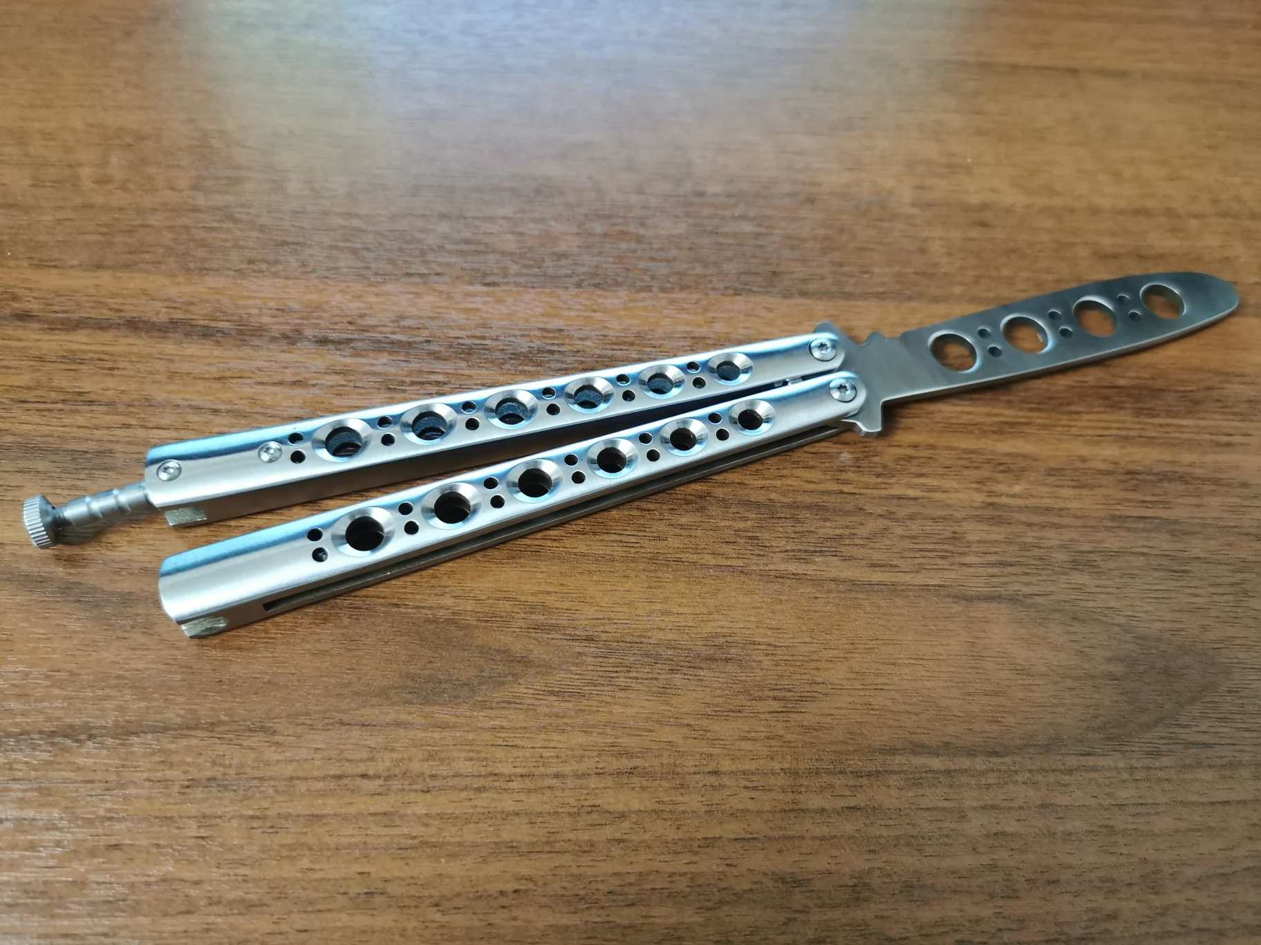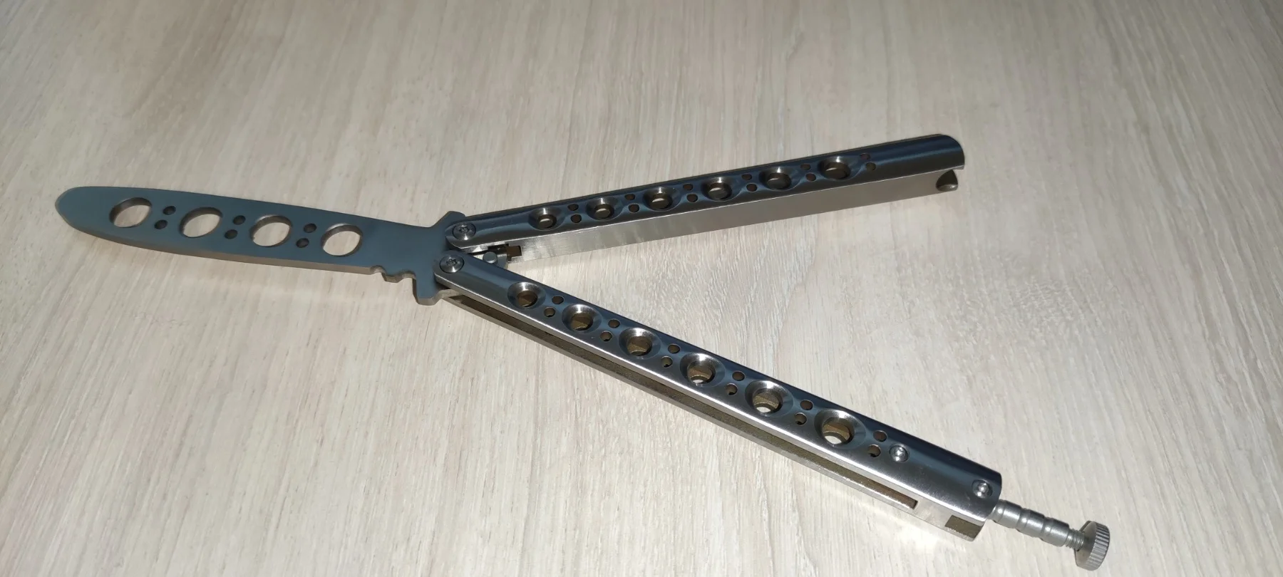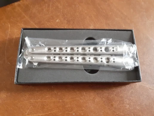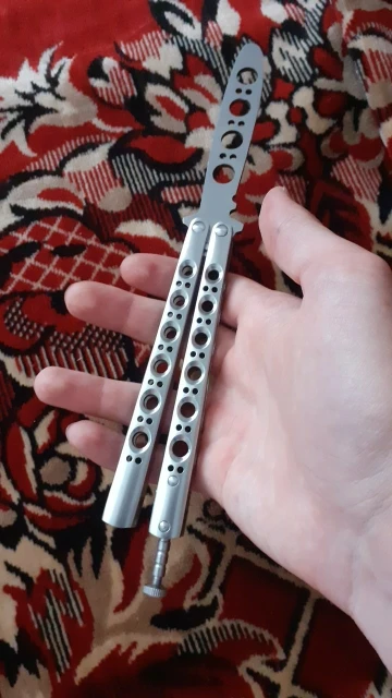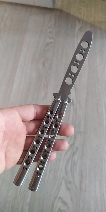 Бабочка нормальная. На шайбах из цветного металла. Рукоятки цельные, не на бонках. В меру тяжёлая. В сложенном виде закрывалась с большим трудом, пришлось немного подпилить выступ-упор с "опасной" стороны клинка. Брал сыну, он доволен.
