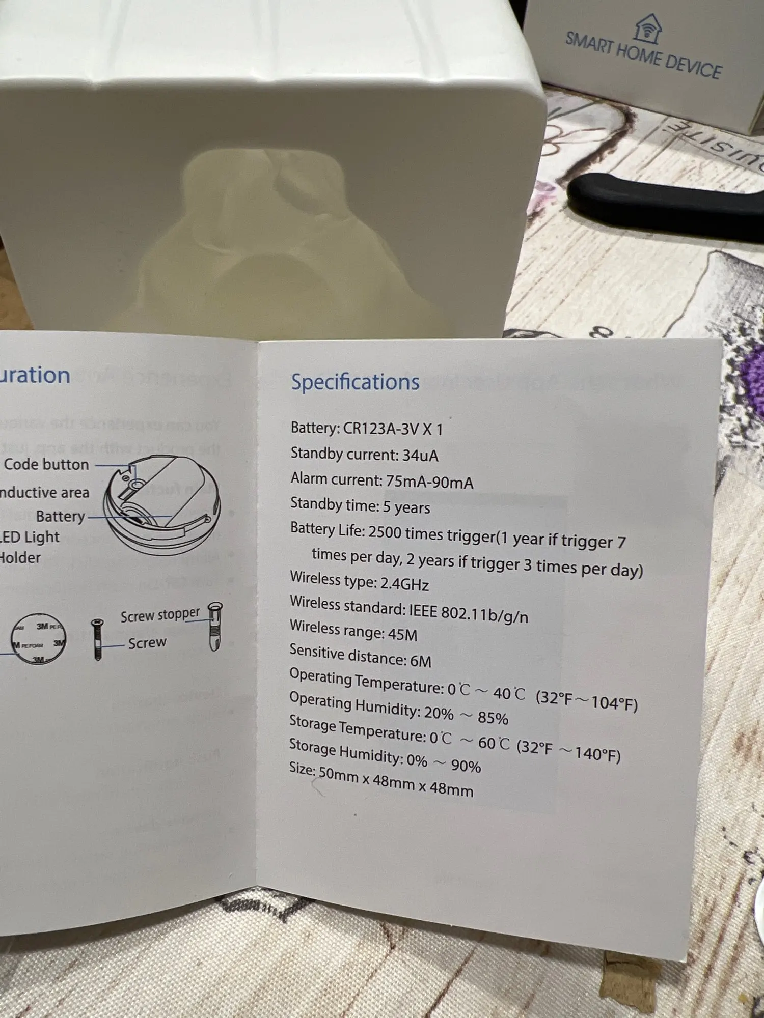 Посылка шла 2 недели. В комплекте батарейка. Маленький. Что не понравилось: 1. в очень маленькой инструкции QR код такой маленький, что телефон теряет резкость, когда вынужден очень близко подносить к нему чтобы скачать программу. 2. У меня роутер раздает wi-Fi 2,4 и 5 Ггц, телефон выбирает сам автоматически 5Ггц и не может соединиться с датчиком. Т.е. датчик работает на старой частоте. Присоединил к старому телефону на 2,4 Ггц. 3. Программа УБОГАЯ! В нее можно добавить очень много разных устройств (судя по списку), но что толку? Звук сигнала не меняется, он мне не нравится. Звук нельзя отрегулировать. Длительность звучания сигнала срабатывания нельзя отрегулировать. Нельзя установить, чтобы при срабатывании датчика на экране появлялось оповещение. Пауза между срабатываниями около 3-х минут. В это время сигнал повторно не звучит. За это время уже пол дома вынесут. Не понятно для чего может пригодиться такой датчик с такими убогими настройками программы. Мне НЕ ПОНРАВИЛОСЬ