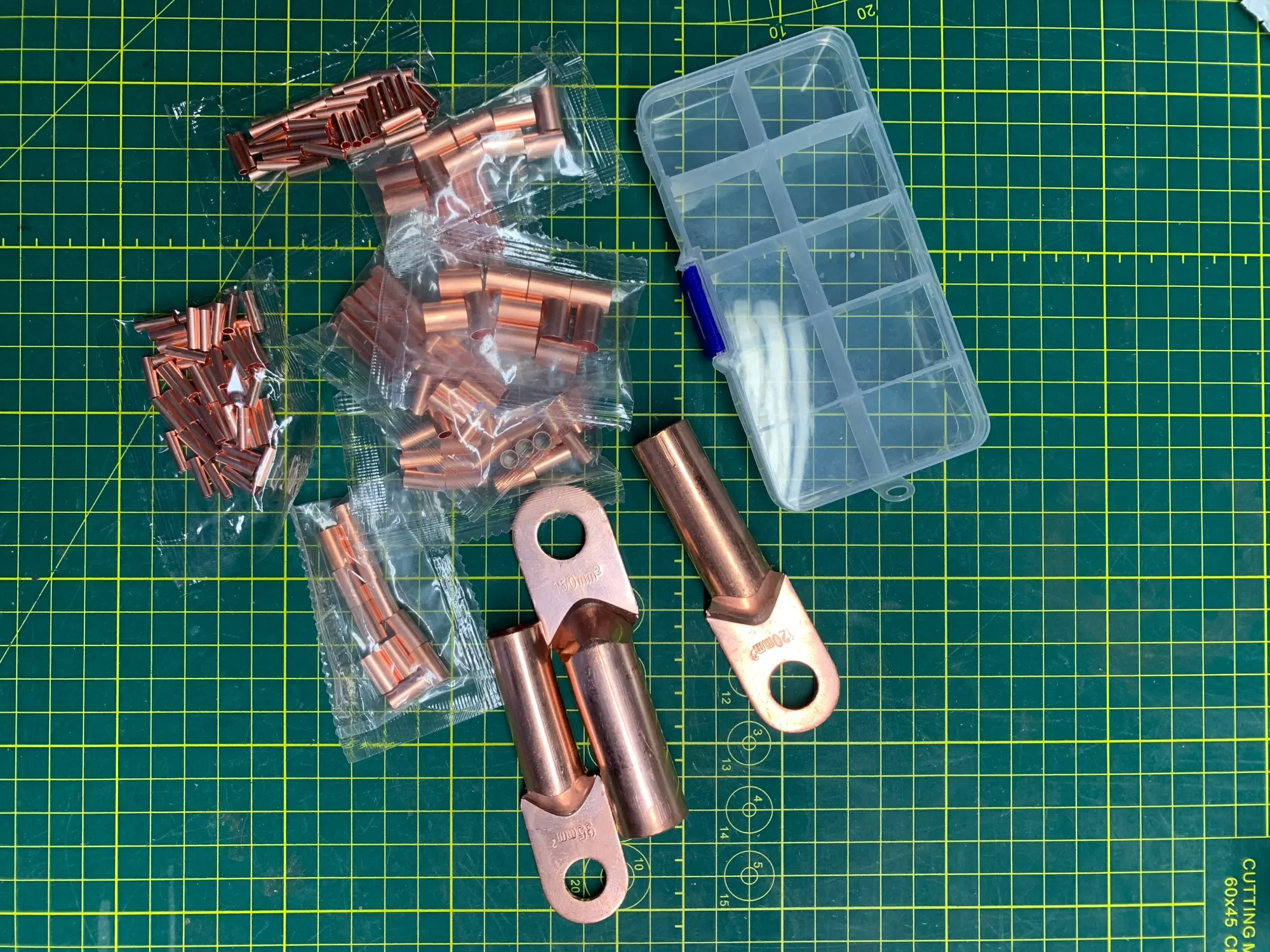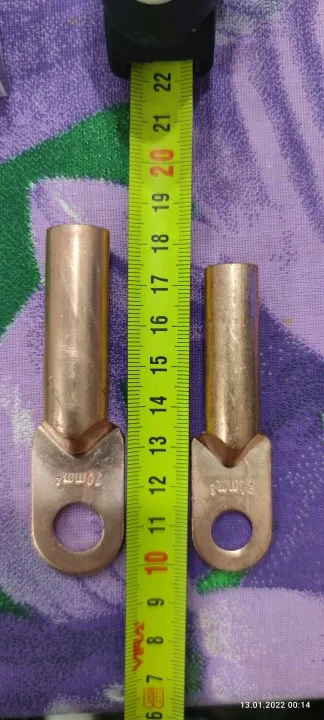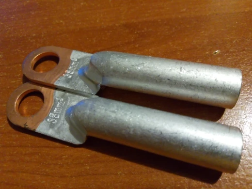 Клеммы полностью медные, стенки достаточно толстые, качество отличное. Доставка до Москвы три недели.