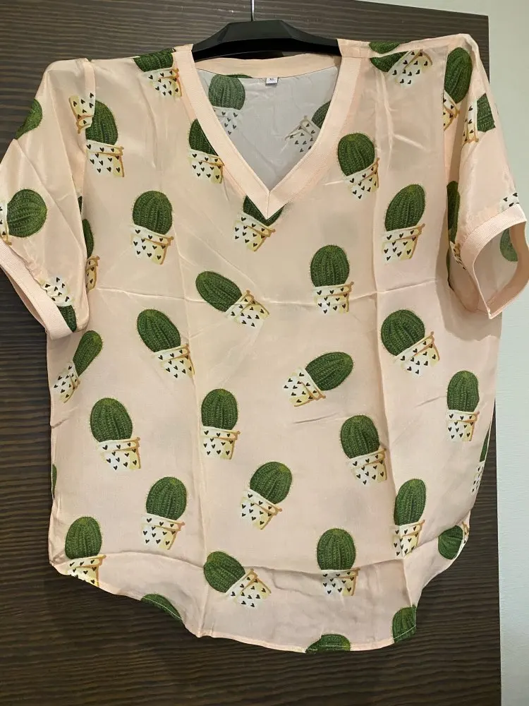 Описание точное, на ог 104 разм.хл, доставка месяц, отправка сразу, трек отслеживался. В подарок носочки и купон на скидку. Футболка тонкая, невесомая, хорошо гладится. Лучше всё-таки, чтоб на изделии были вытачки для груди