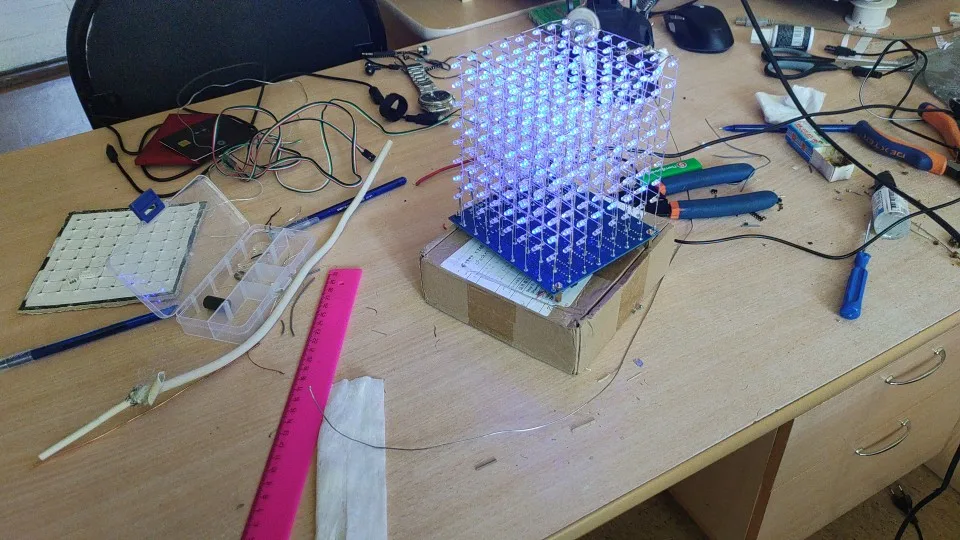 Ну что сказать, собрать этот куб, это нужны нервы и усидчивость )) Собирал 3 дня, выпил 3 бутылки коньяка )) Паять эти матрицы и гнуть диоды это то еще занудство.. )) Но результатом я полностью доволен, выглядит красиво, осталось тока разобраться с прошивкой своих спецэффектов благо в нете все есть если поискать. После 2 дней пользования вылетели 2 диода в 1 сетке, поэтому рекомендую перед окончательной сборкой сетки со светодиодами погонять часа 3, чтоб слабые диодики повыгорали, иначе потом геморно все распаивать и менять светодиоды