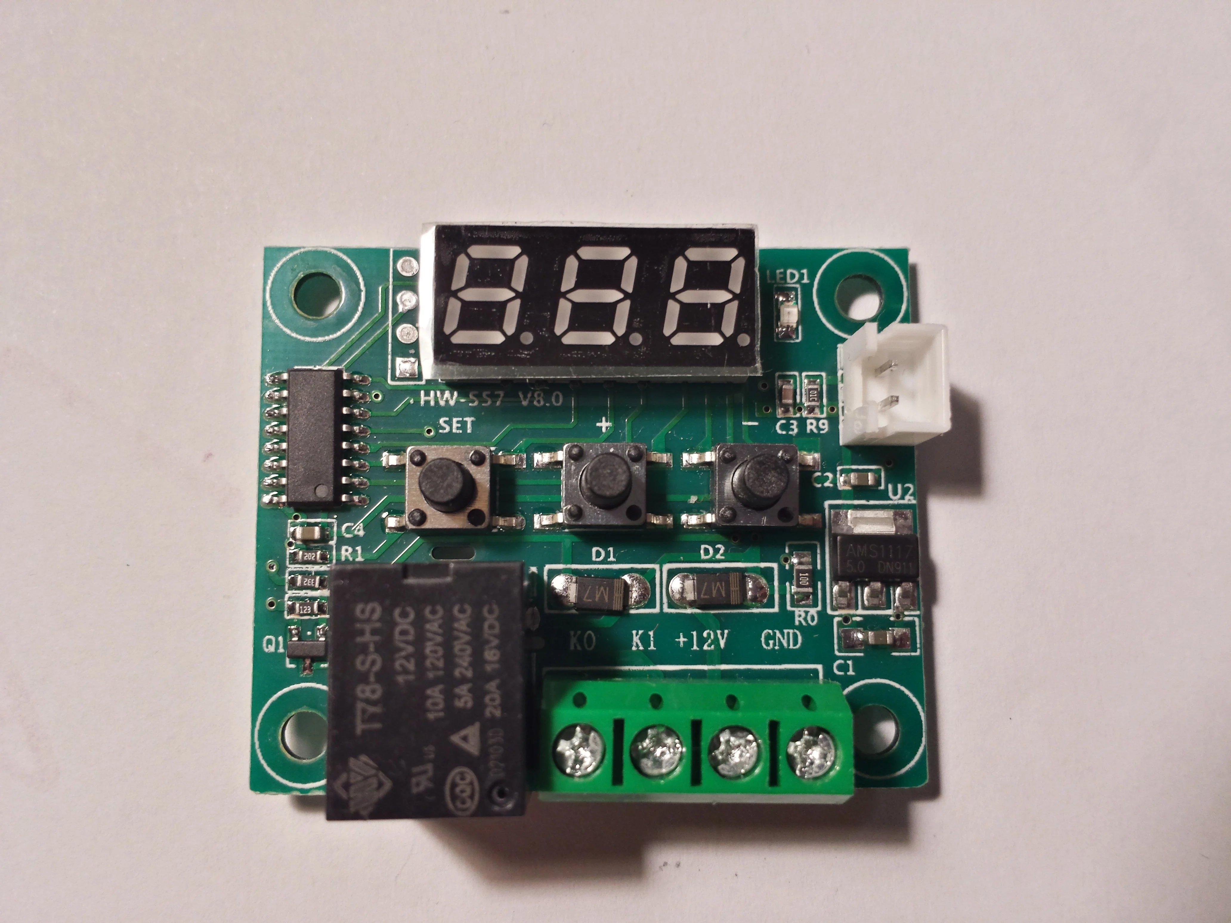 Спасибо за быструю доставку. Описанию соответствует. У меня реальный ток потребления в паузе 15mA, а при срабатывании реле около 30mA. При настройке очень заметен дребезг контактов кнопок. Периодически, где-то раз или два в минуту показания температуры прыгают на градус с возвратом к прежним показаниям при следующем отображении (менее секунды) . Остальное время либо не меняются, либо изменяютя на 0.1....0.3°C. Возможно влияние питающего модуля step-down 220v —> 12V 300mA (max) (Характеристики модуля питания). Модулем (товаром) доволен.