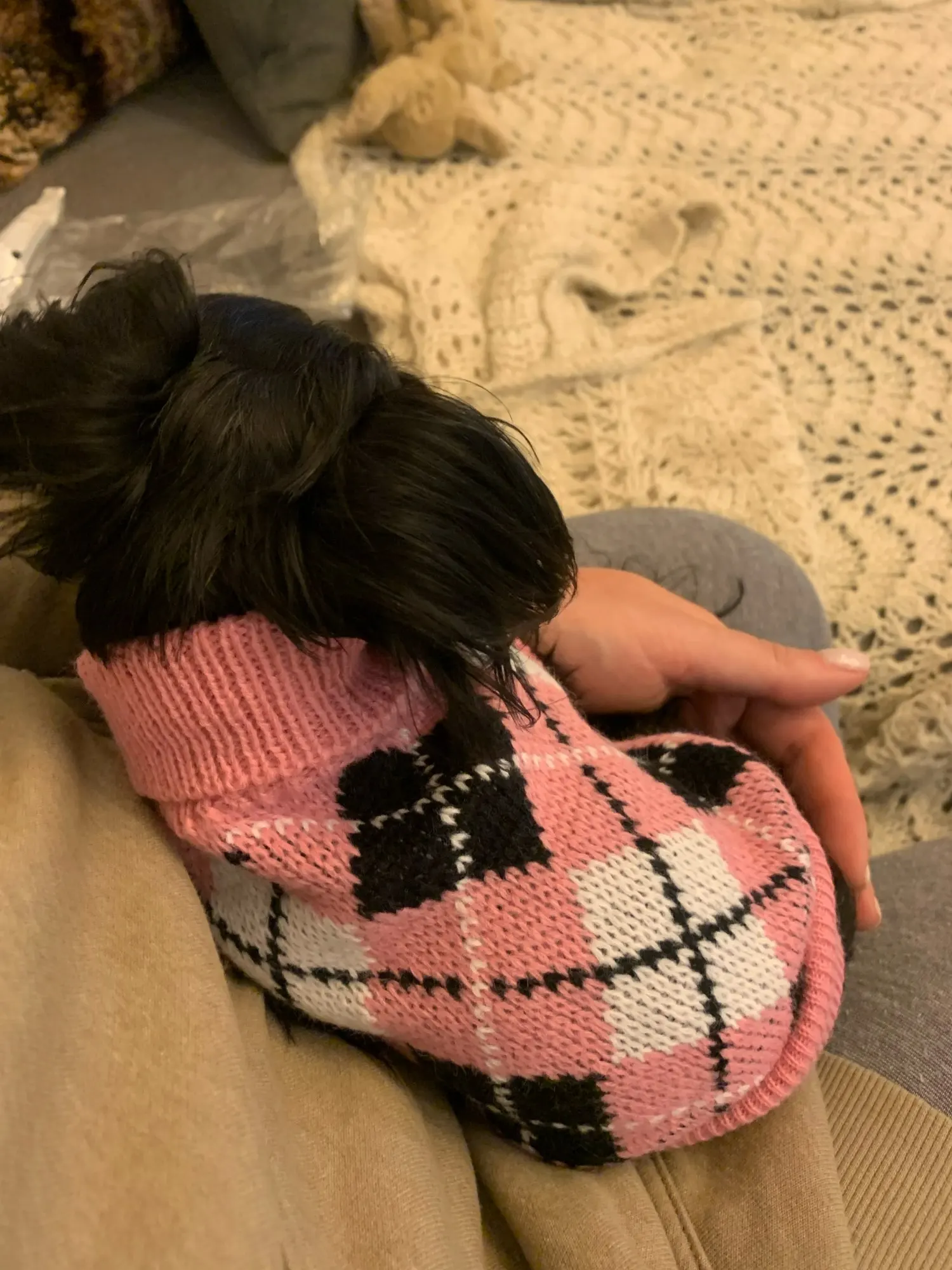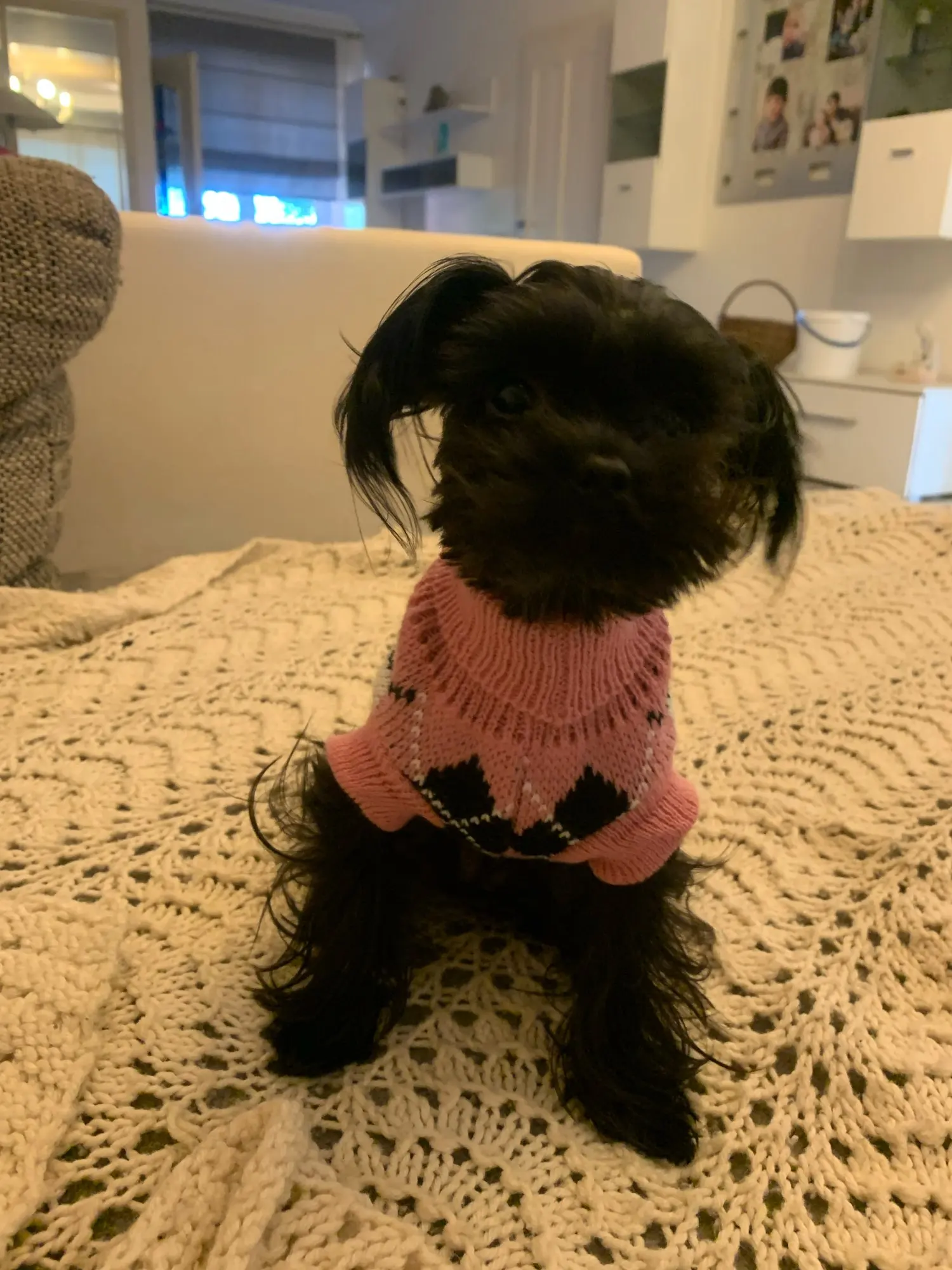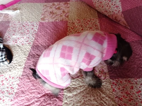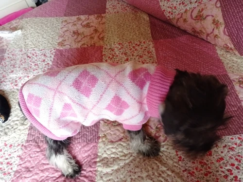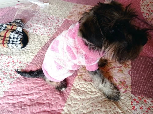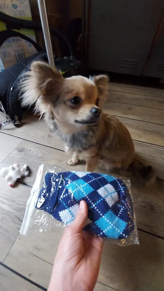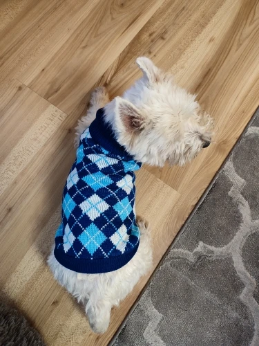 Очень качественный и красивый свитер, но на худенького йорка с длиной спины 30 см длинноват. Это было бы менее критично, если бы это был не кобель. А так закрыт живот полностью до задних ног, учитывайте это при заказе. Зато на девчонок будет отлично. Но так как синяя резинка по низу не вывязана, а пришита, я смогу его перешить и укоротить на мою собаку.