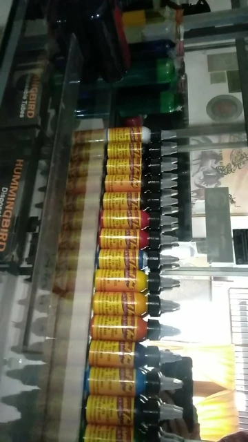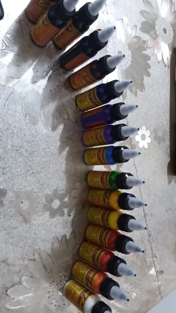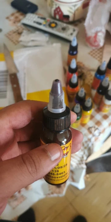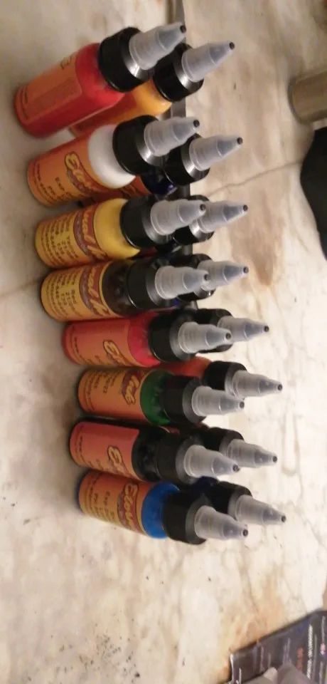 товар шёл долго, завис в Китае, пигмент отвратителтный, из всех, заходит только черный, остальные вообще не вбивает. Такими красками не то что человека, резину бить опасно!