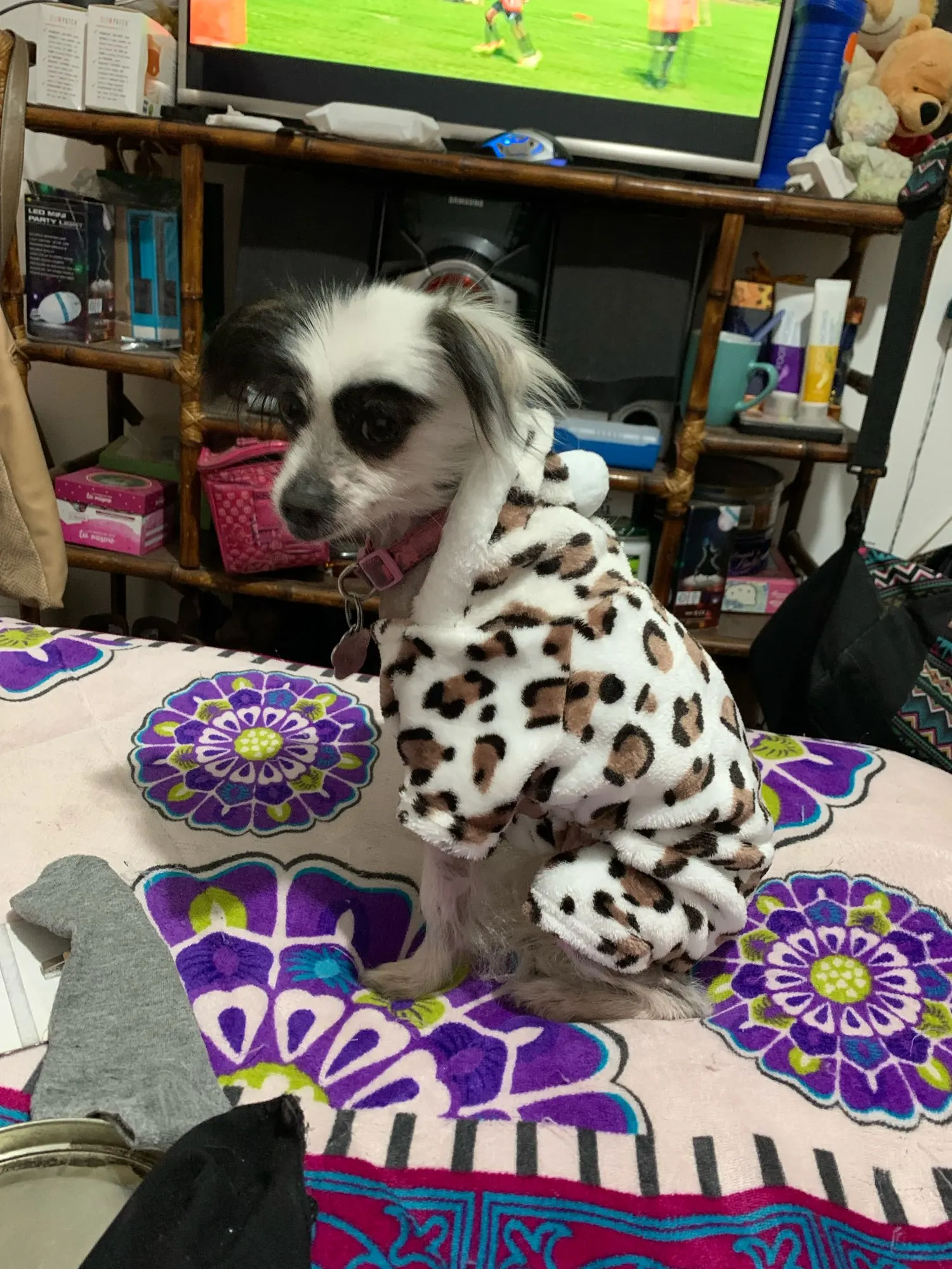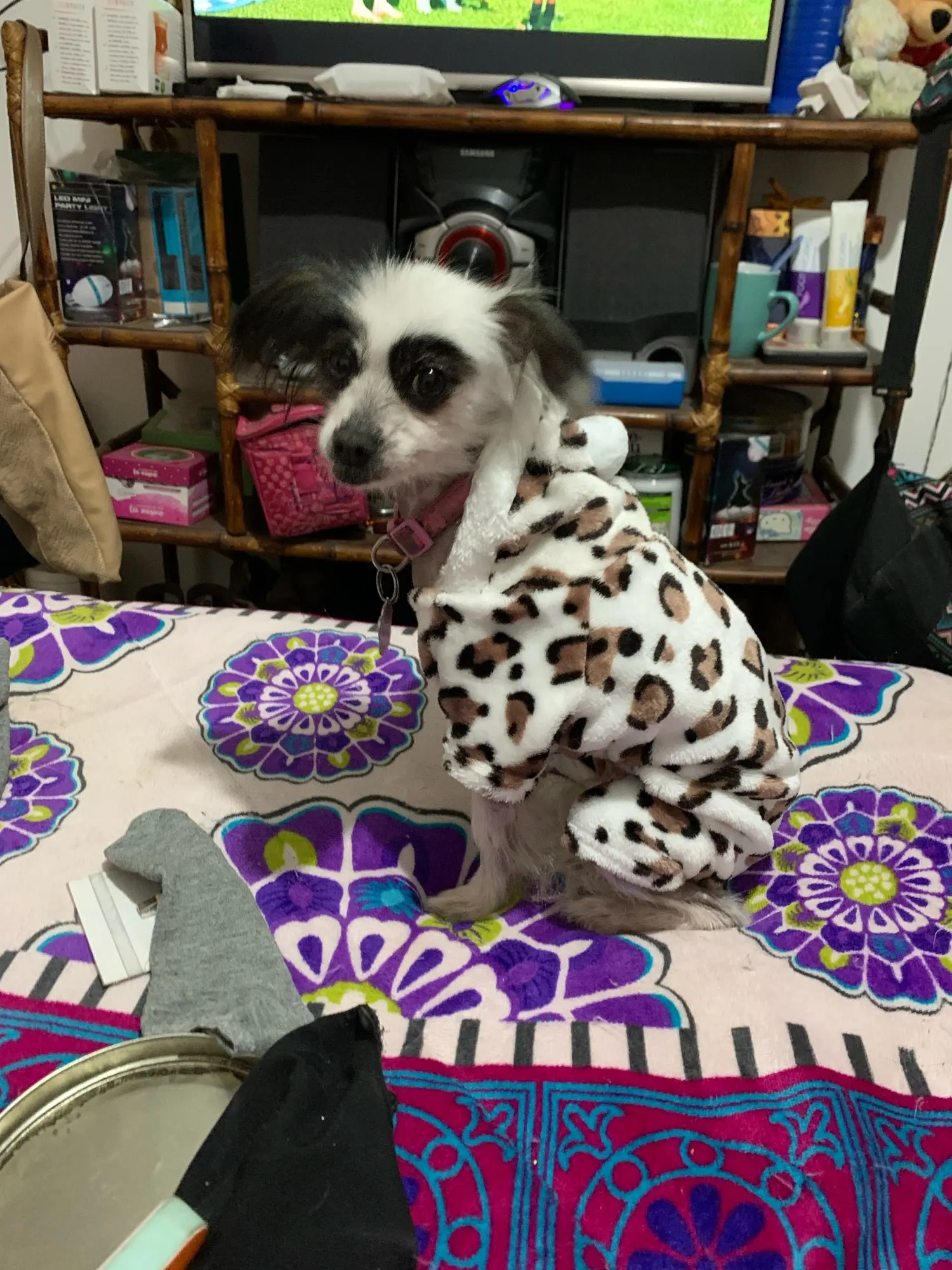 симпатичный комбез, но закрывает хвостик. надо делать дырочку для хвоста. брал для китайской хохлатой 6 кг Xl