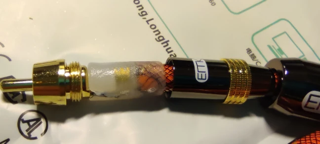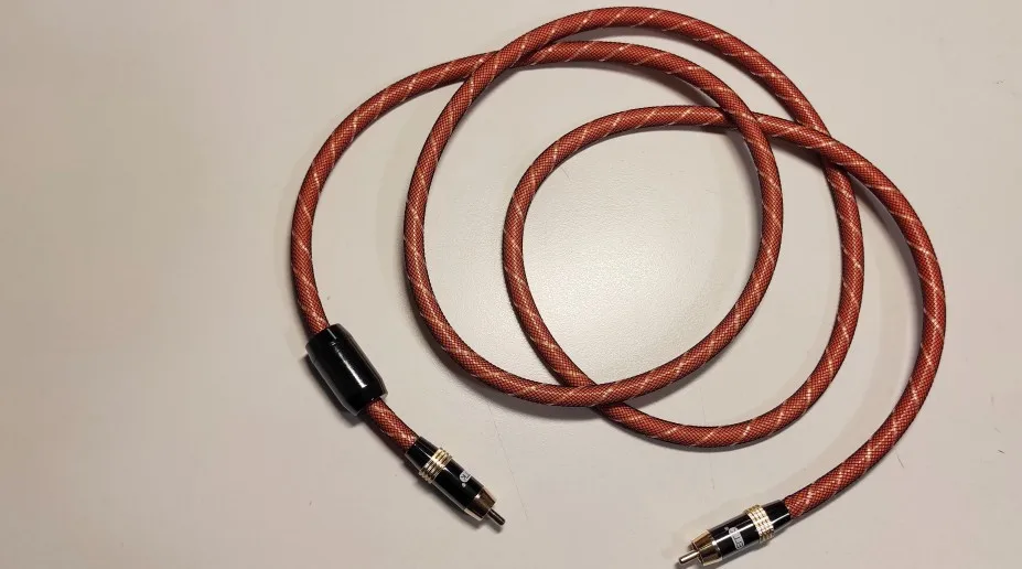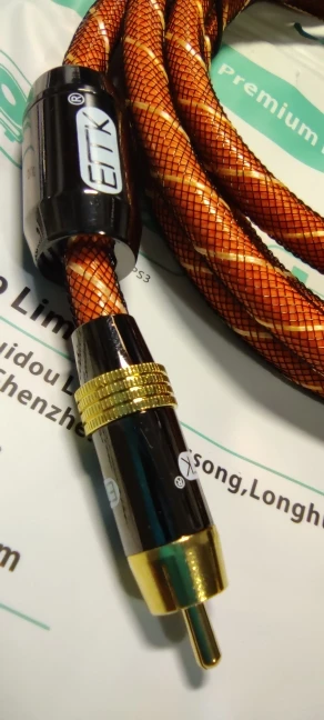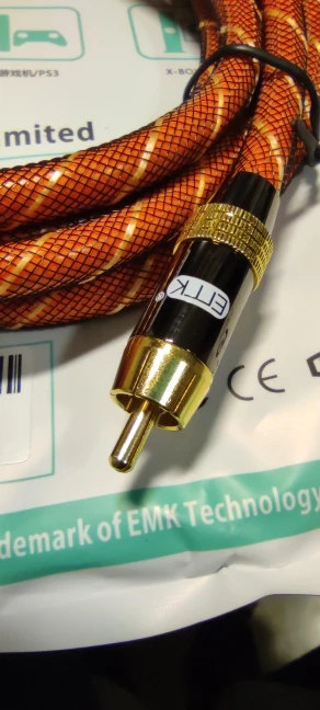 Кабель жесткий, длинна соответствует описанию, заказывал 8 метров. Разъемы RCA вроде бы качественные, на фото видно что место пайки залито чем-то вроде пластика за это явно плюс к надежности, при длине 8 метров фоновый шум на сабвуфере все же есть, до этого был кабель длинной 6 метров другого производителя и фонового шума не было.