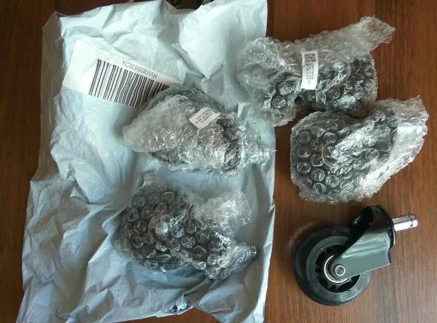 Отличные колеса! Безшумные, мягкие и не портят пол. Пришли обернутые в "пупырку" и в сером почтовом конверте.