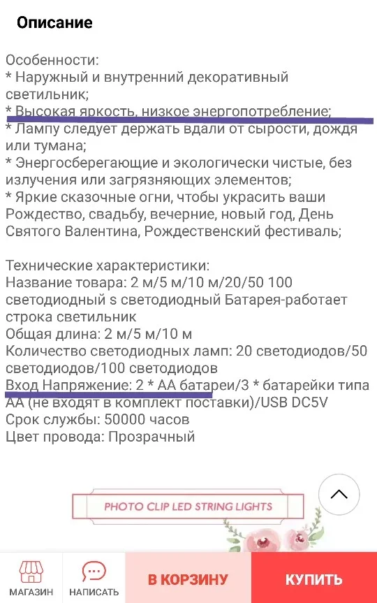 Доставка быстрая. На этом плюсы заканчиваются. Брали 2м 20pcs. Немного отличается от описанного (батареек нужно не 2, как описано, а 3). Светит на грани видимости, практически никак. Спор решили в мою пользу, но деньги не вернули. Просят возврат товара, но оплачивать нужно мне. Качество товара оставляет желать лучшего.