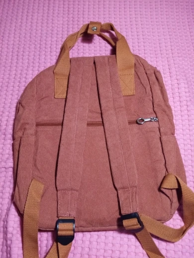 Рюкзак красивый, но скорее розоватый, чем оранжевый. Размер средний, войдет а4 и еще несколько вещей, не объёмный. Сзади на ремнях много ниток торчит.