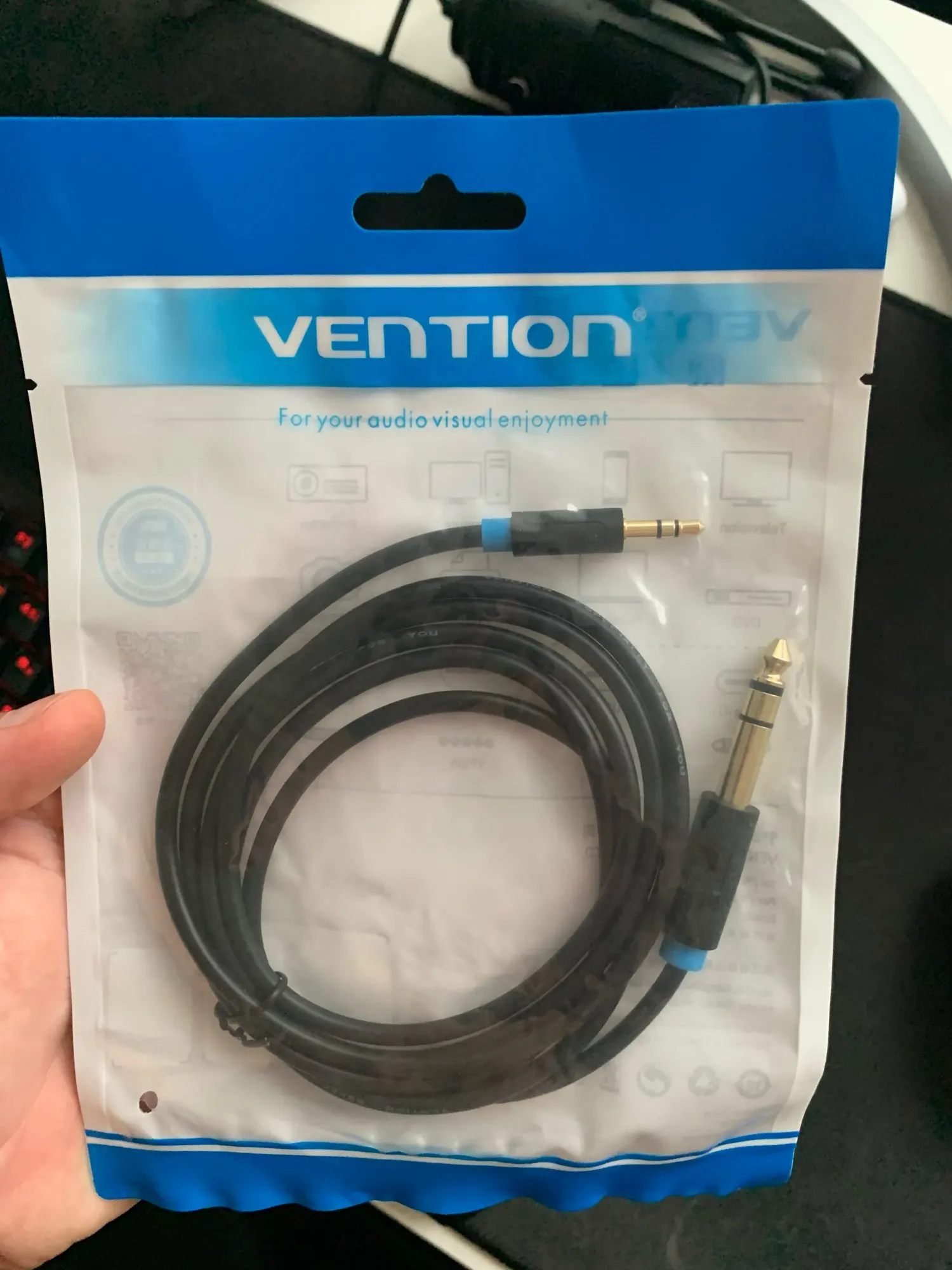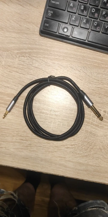 Провод хороший, тоньше, чем обычные 6.3 jack - 6.3 jack, хотя может это только у меня такой. Подключил гитару напрямую в линейный вход(не микрофонный, а именно линейный без предусиления). Играет тихо, но если зайти в Guitar Rig 5 и поставить пресет с каким нибудь кабинетом или бустером, то звук получается громким. Шумы есть, но сильно не раздражают. Шумы из-за длинного провода (3м) и большого количества разной техники. На фотографии несколько проводов сразу.