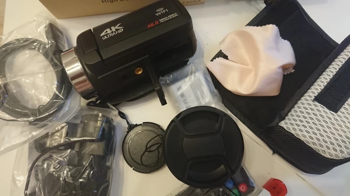 В комплекте кабель hdmi, usb для зарядки и передачи данных на компьютер, блок питания, тряпочка микрофибра, чехол, пульт и инструкция на английском языке. Качество видео, при хорошем освещении, достойное, при недостаточном, естественно, посредственное. Звук глуховат. Топчег за свою цену.