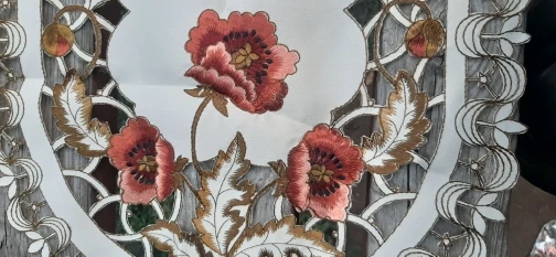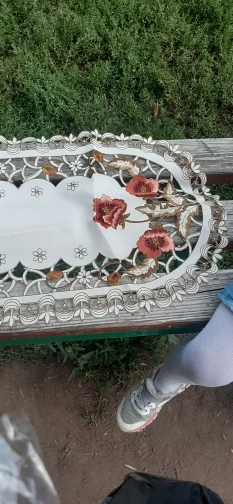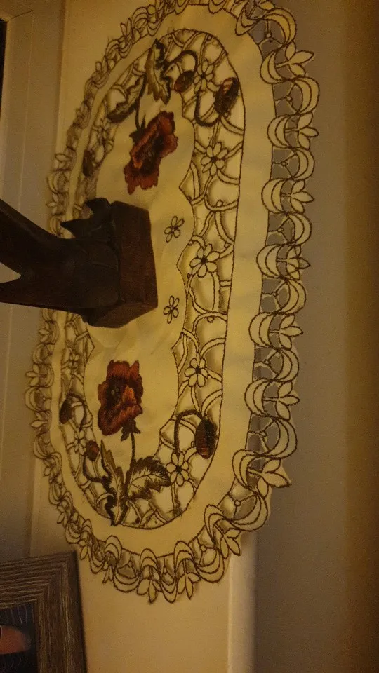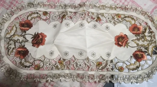 Милая салфетка с трафаретной вышевкой на ткани, но дорогая на мой взгляд. Доставка быстрая, спасибо!