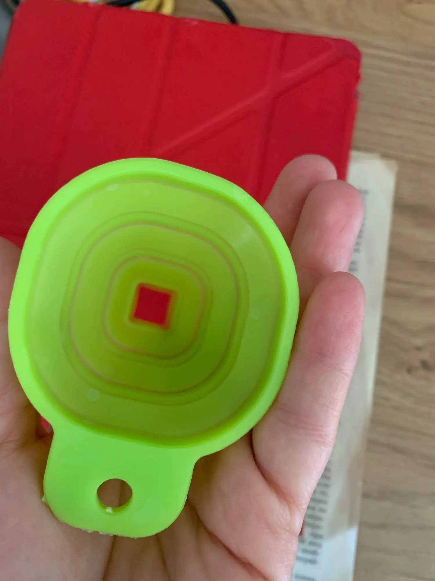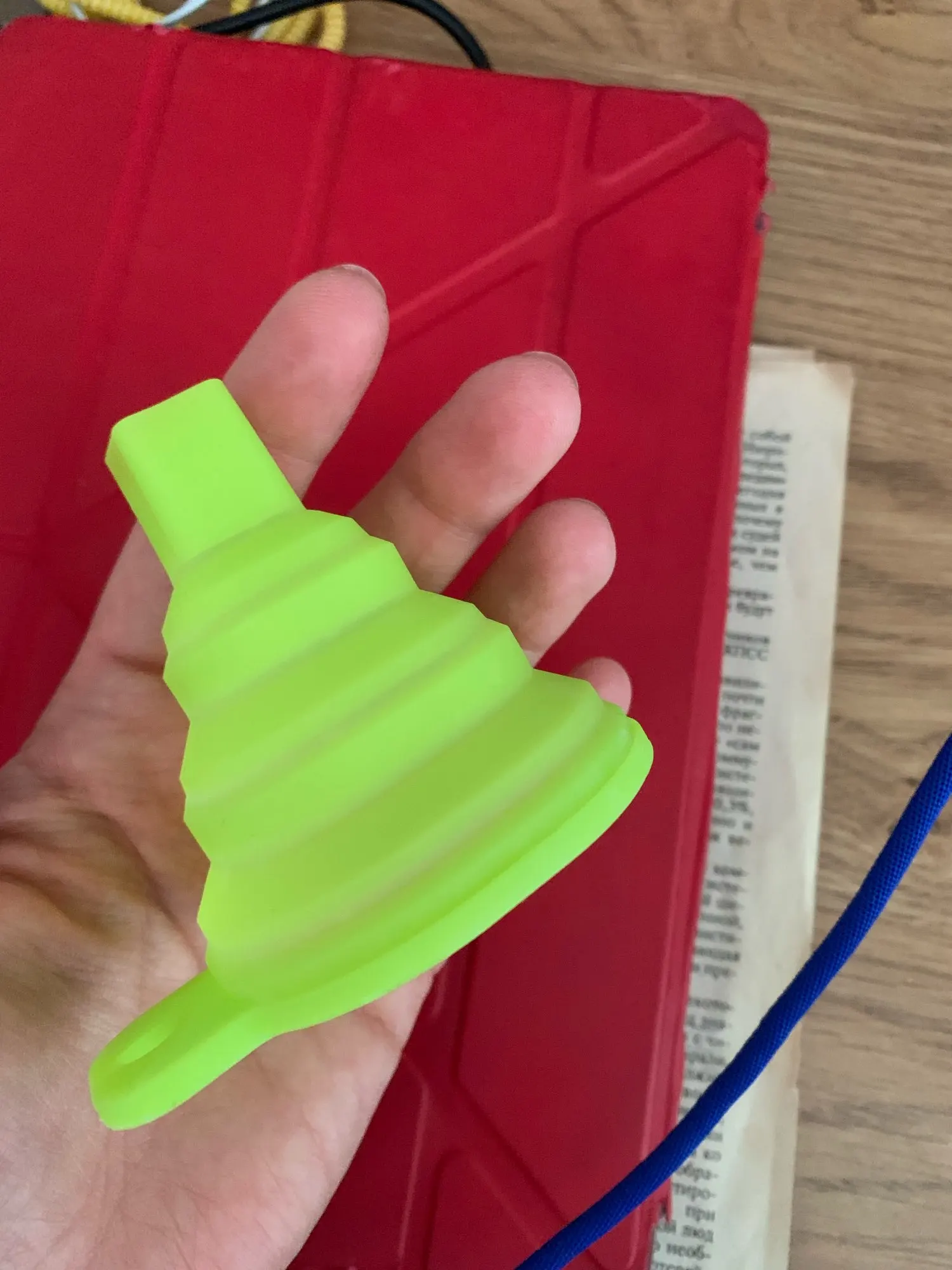 Заказ обнаружила в почтовом ящике. Воронка маленькая, см 5 в диаметре думаю-) складывается