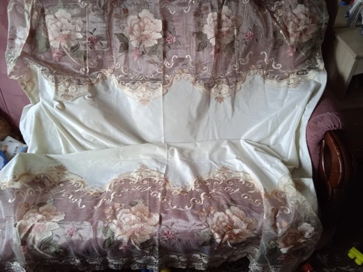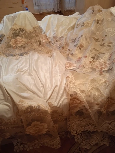 Тюль отшита по моим размерам, ширина полотна 5 метров, органза светлый беж с вертикальными золотыми полосками которые при освещении блестят, с вышитыми цветами по всему полю что делает её очень нежной и красивой!, доставка долгая. Были небольшие нюансы в заказе-но они решены! По этому магазин рекомендую. Заказом довольна.