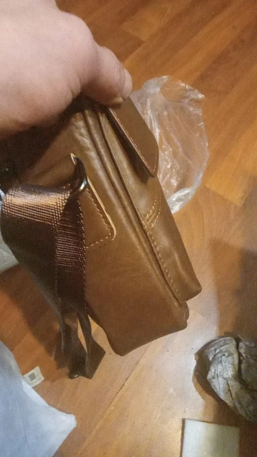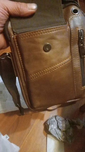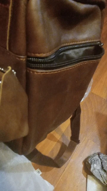 Сумка немного кривовато сшита, особенно передний карман. Материал кожа. Доставка очень быстрая. За 1000 пойдёт, надеюсь послужит.