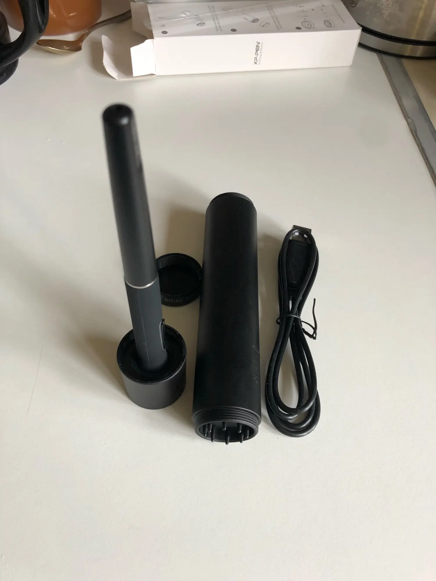Доставка 15 дней. Ручка с чехлом и кабелем для зарядки. в чехле размещено 8 запасных стержней. Пока не проверял.
