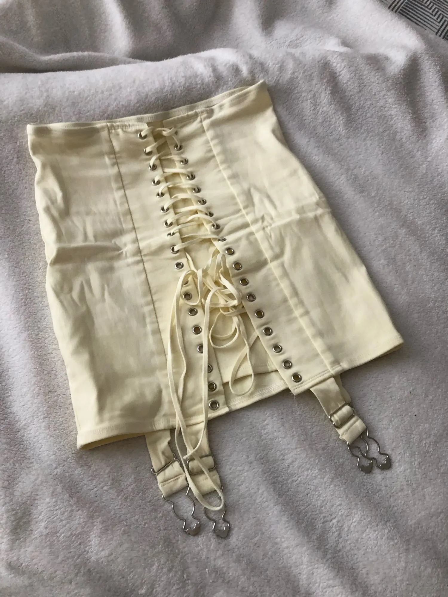 Юбка в точности как на фотографии, неприятного запаха нет. Примерный срок доставки - три недели. Шнур пришёл в отдельном пакете, но шнуруется достаточно быстро, я управилась минут за 10, так что не критично. На параметры 68-110 взяла M, сидит как на картинке.