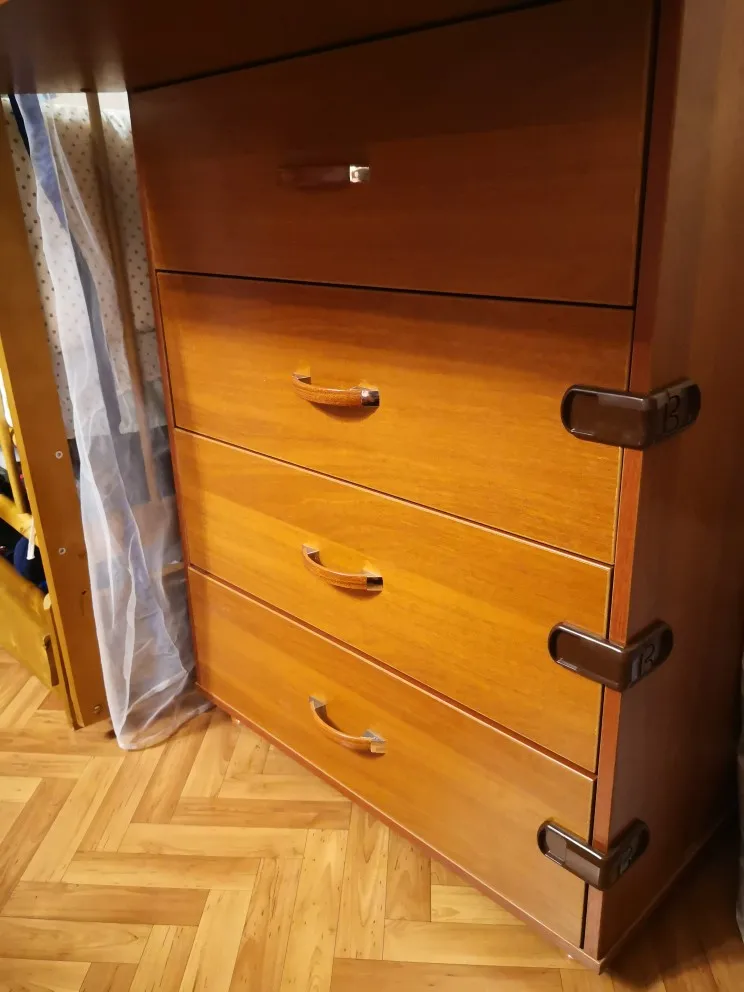 Отлично. Скотч пока держит. Приехало примерно за месяц. На время, пока малой шнурит по ящикам этих защёлок хватит.