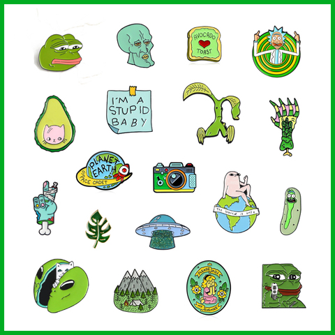 Зеленая эмалированная брошь, животное, лягушка, кошка, сплав, значки, горный пик, листья, летающая тарелка, скелет земли, камера, заколка, ювелирное изделие, подарок