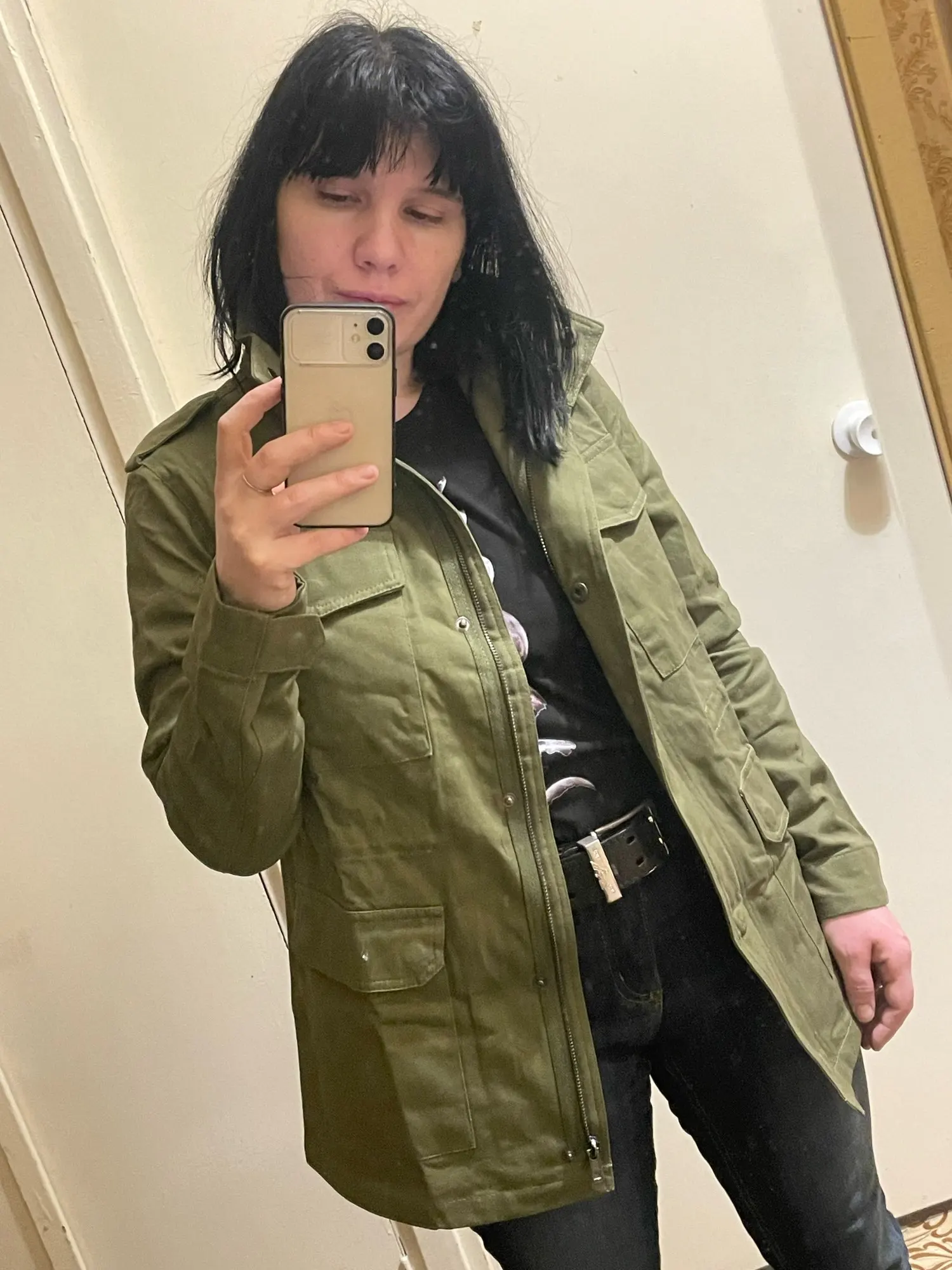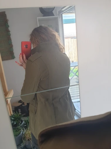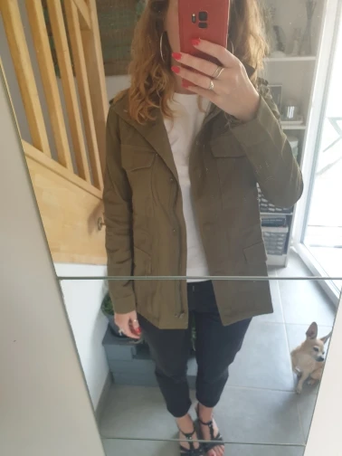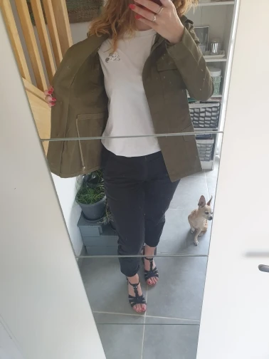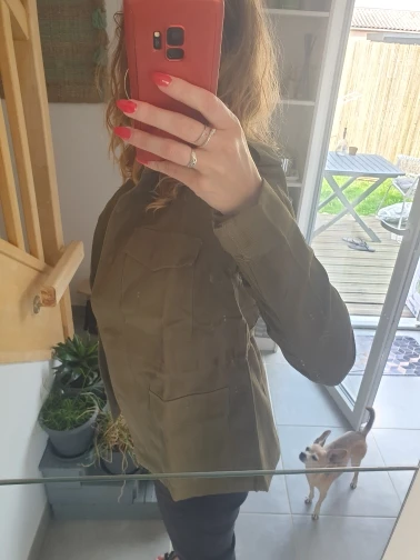 Супер куртка. Размер S на 86-73-96 идеально, но не на коротышек. Мне, с моим ростом в 158 см надо рукава загибать и филейную часть почти полностью закрывает. Прошита аккуратно.