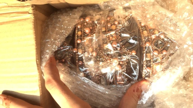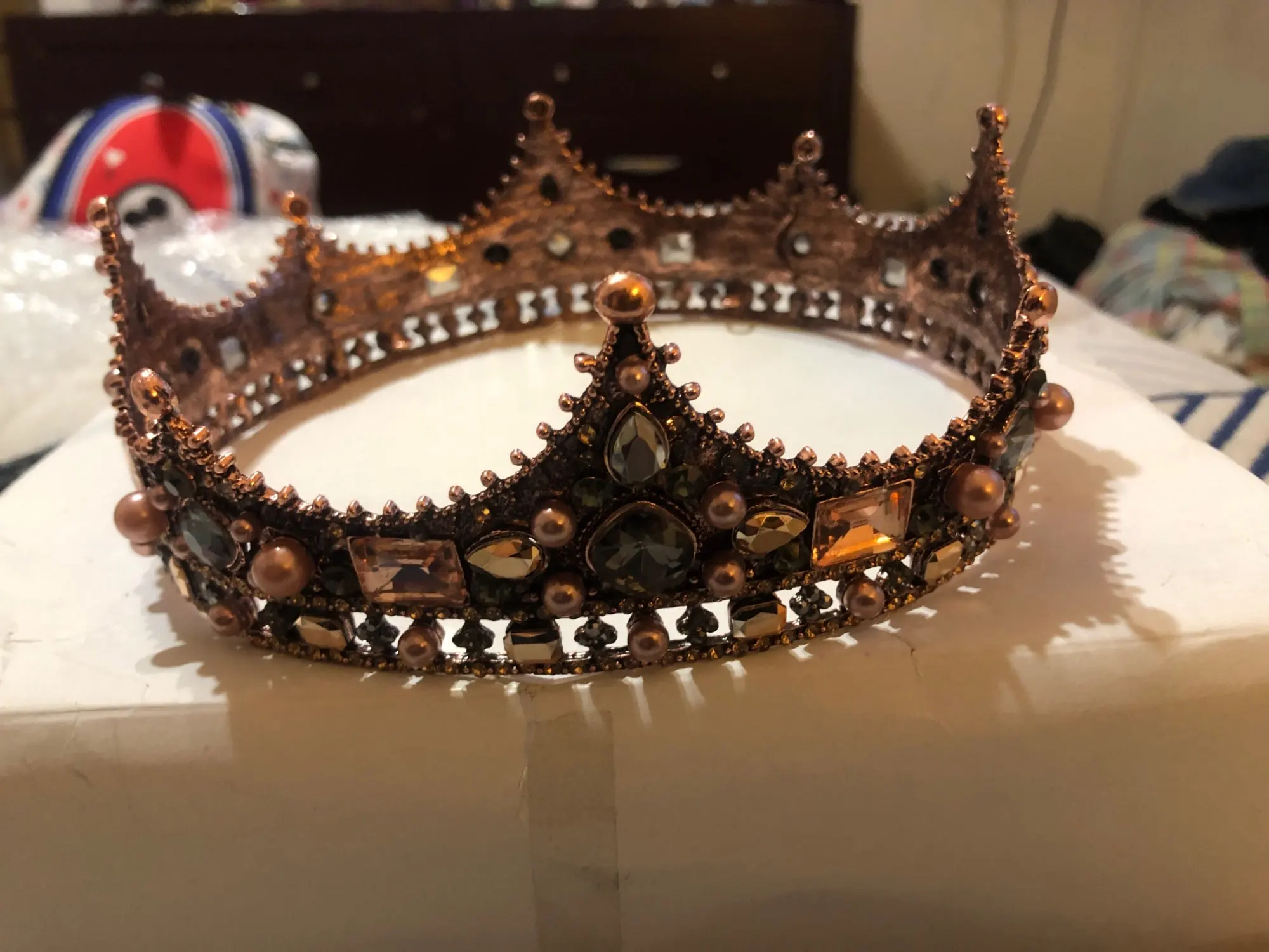 Корона красивая. Но упаковка не продумана. Коробку надо заполнять пенопластом, чтобы выступающие части доезжали целыми. Ну и камни слабо закреплены. Три отвалилось, пока рассматривали корону. Пришлось поработать клеем.