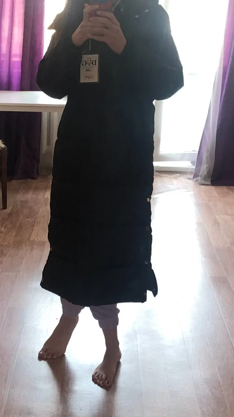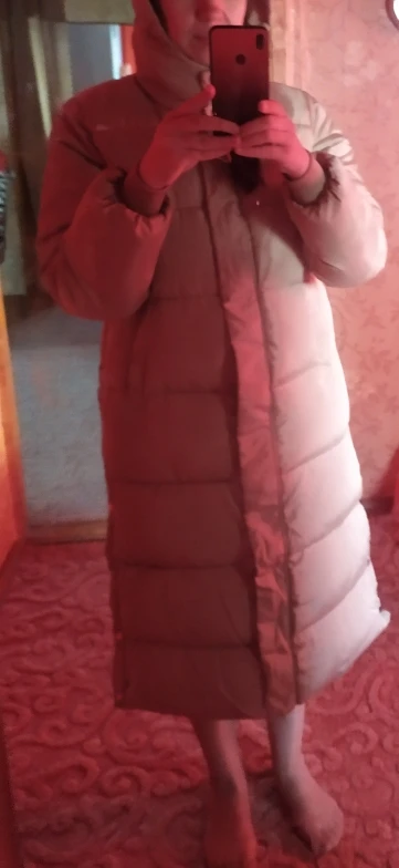 Она реально теплая, в минус 20 со свитером не замерзла. На рост 173 идеальная. Капюшон удобный. Внизу молнию расстегнуть надо.